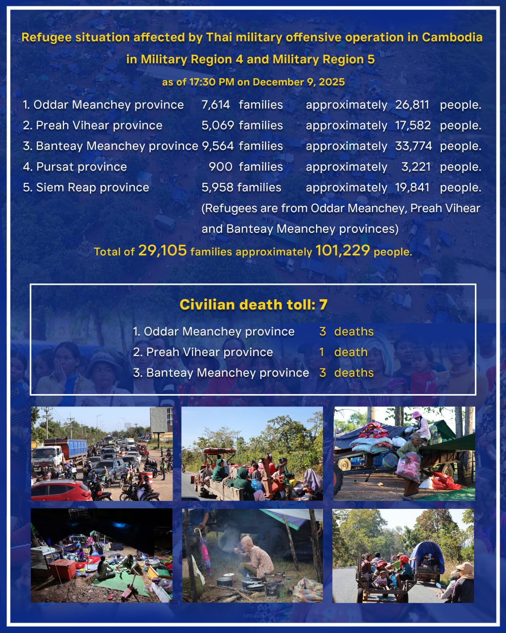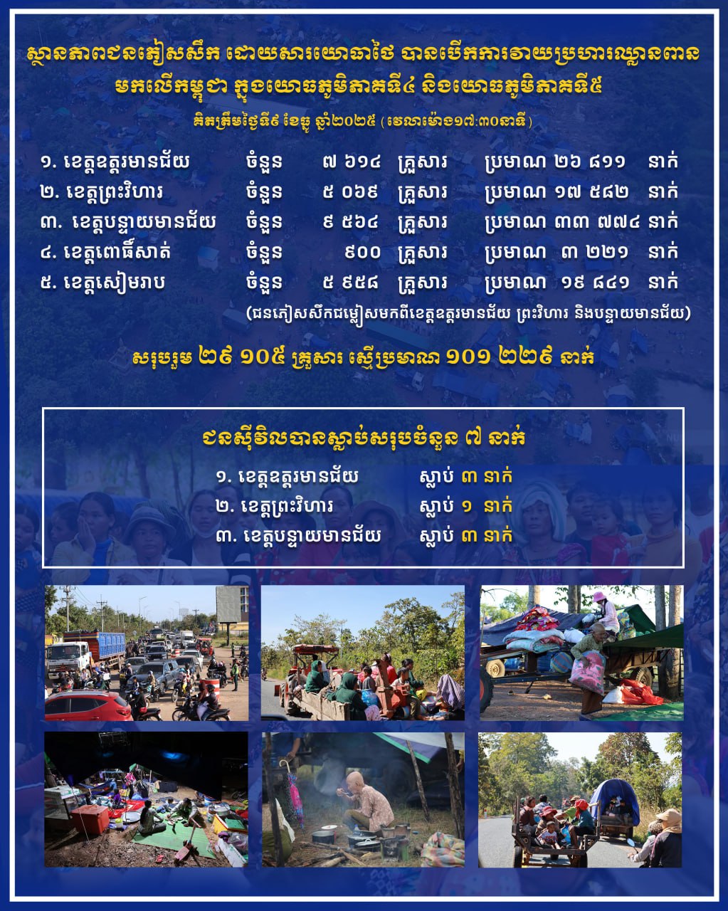 ស្ថានភាពជនភៀសសឹក ដោយសារយោធាថៃបានបើកការវាយប្រហារឈ្លានពានមកលើកម្ពុជាក្នុងយោធភូមិភាគទី៤ និងយោធភូមិភាគទី៥ គិតត្រឹមថ្ងៃទី៩ ខែធ្នូ ឆ្នាំ២០២៥ វេលាម៉ោង ១៧:៣០នាទីល្ងាច