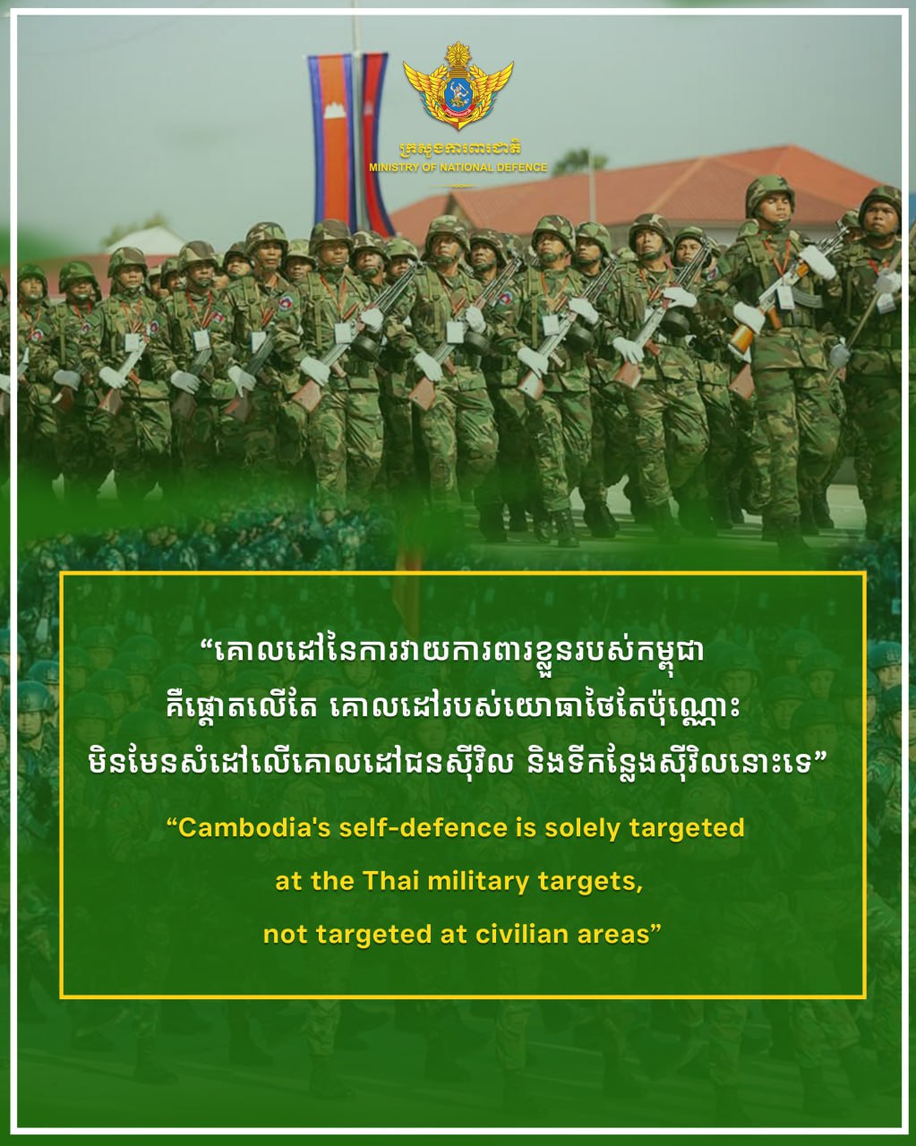«គោលដៅនៃការវាយការពារខ្លួនរបស់កម្ពុជា គឺផ្តោតលើតែ គោលដៅរបស់យោធាថៃតែប៉ុណ្ណោះ មិនមែនសំដៅលើគោលដៅជនស៊ីវិល និងទីកន្លែងស៊ីវិលនោះទេ»។ កម្ពុជាតែងតែប្រកាន់ខ្ជាប់នូវការគោរព និងអនុវត្តនូវរាល់កាតព្វកិច្ចទាំងឡាយនៅក្រោមច្បាប់អន្តរជាតិ ជាពិសេសច្បាប់មនុស្សធម៌អន្តរជាតិយ៉ាងម៉ឺងម៉ាត់ និងច្បាស់លាស់បំផុត។