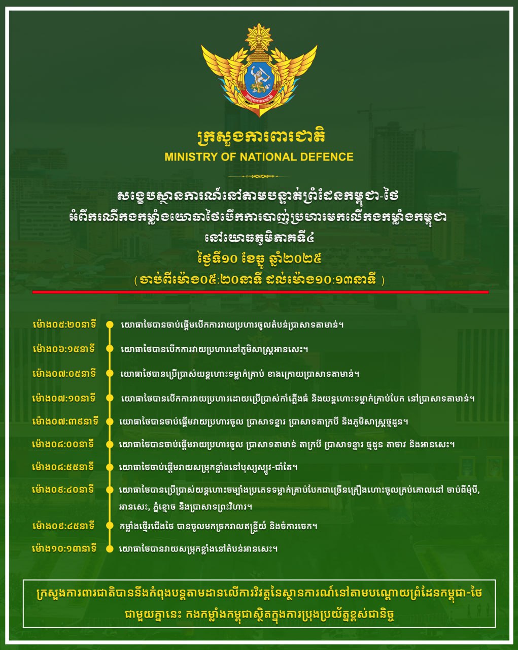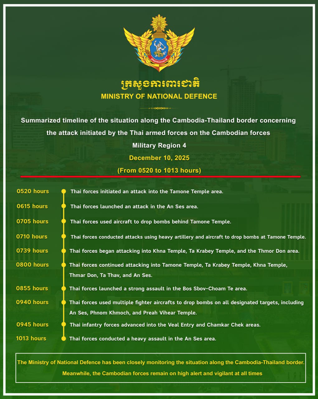 Summarized timeline of the situation along the Cambodia-Thailand border concerning the attack initiated by the Thai armed forces on the Cambodian forces in Military Region 4 on 10 December 2025 (from 0520 to 1013 hours).
