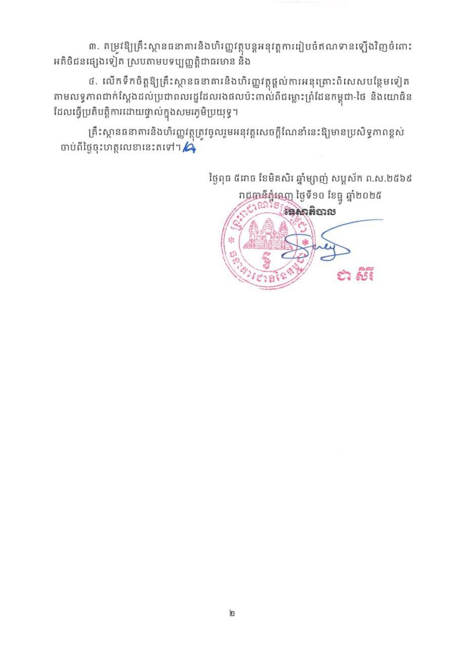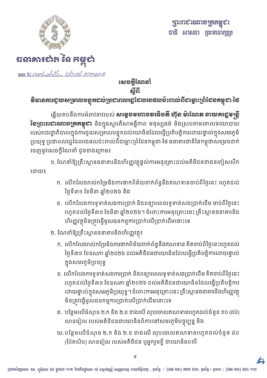 ធនាគារជាតិនៃកម្ពុជា បញ្ជាឱ្យធនាគារហិរញ្ញវត្ថុលុបចោលឥណទាន៨០លានរៀល ជួនអតិថជន យោធិន ជនភៀសសឹក ពន្យាពេលនៃការបង់ និងមិនផាក់ពិន័យរហូដល់ថ្ងៃទី៣១ មីនា ឆ្នាំ២០២៦