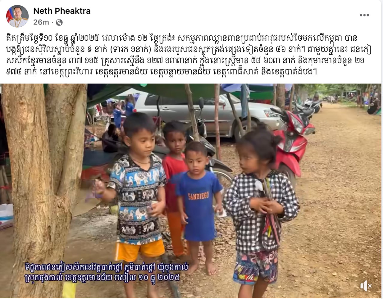 (ភ្នំពេញ)៖ លោក នេត្រ ភក្ត្រា រដ្ឋមន្ត្រីក្រសួងព័ត៌មាន បានឱ្យដឹងថា គិតត្រឹមថ្ងៃទី១០ ខែធ្នូ ឆ្នាំ២០២៥ វេលាម៉ោង ១២ ថ្ងៃត្រង់៖ សកម្មភាពឈ្លានពានប្រដាប់អាវុធរបស់ថៃមកលើកម្ពុជា បានបង្កឱ្យជនស៊ីវិលស្លាប់ចំនួន ៩នាក់ (ទារក ១នាក់) និងរងរបួសជនស្លូតត្រង់ផ្សេងទៀតចំនួន ៤៦នាក់។