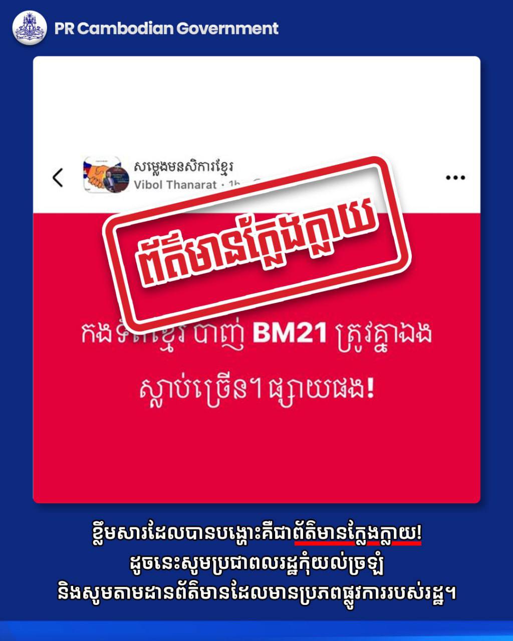 <ខ្លឹមសារដែលបានបង្ហោះគឺជាព័ត៌មានក្លែងក្លាយ!> ដូចនេះសូមប្រជាពលរដ្ឋកុំយល់ច្រឡំ និងសូមតាមដានព័ត៌មានដែលមានប្រភពផ្លូវការរបស់រដ្ឋ។