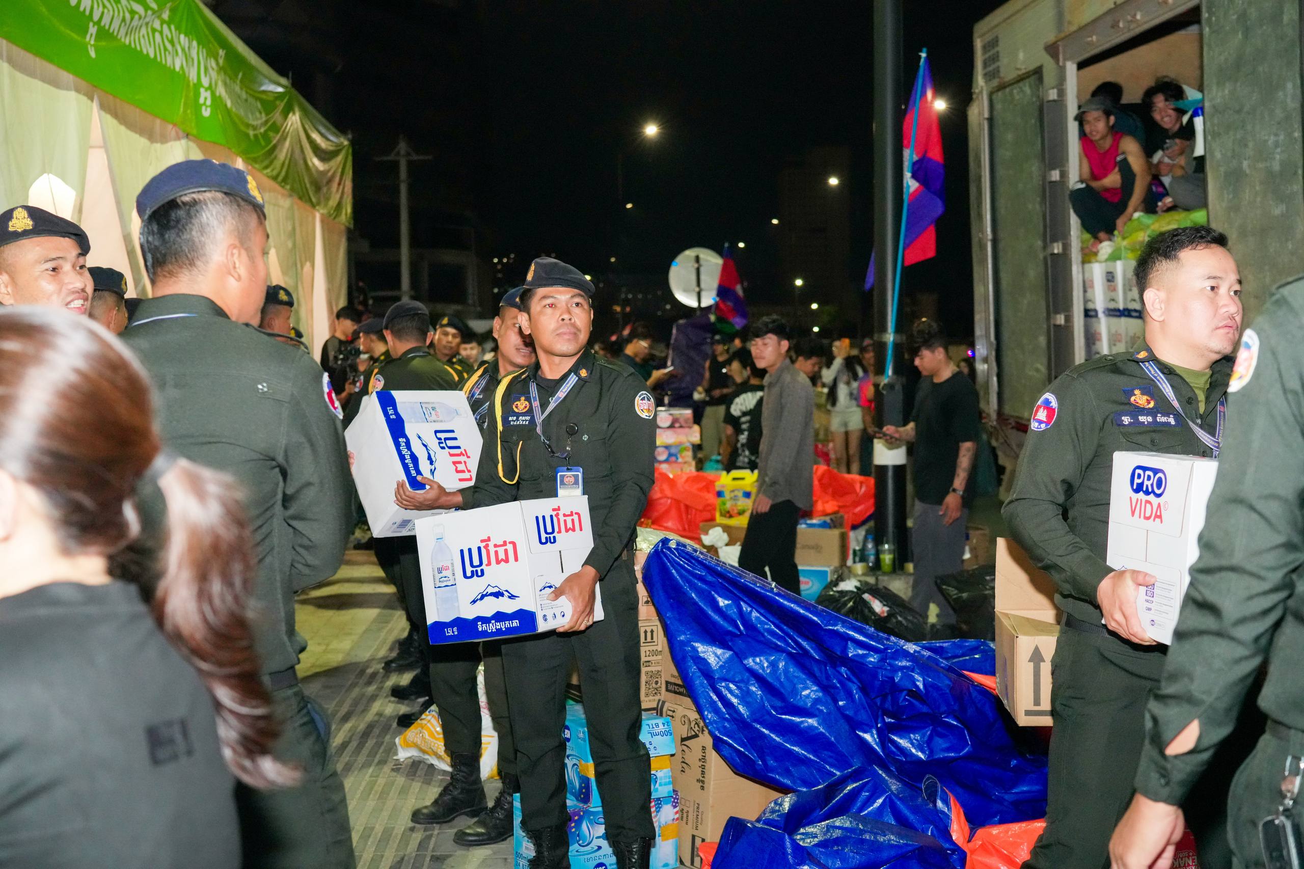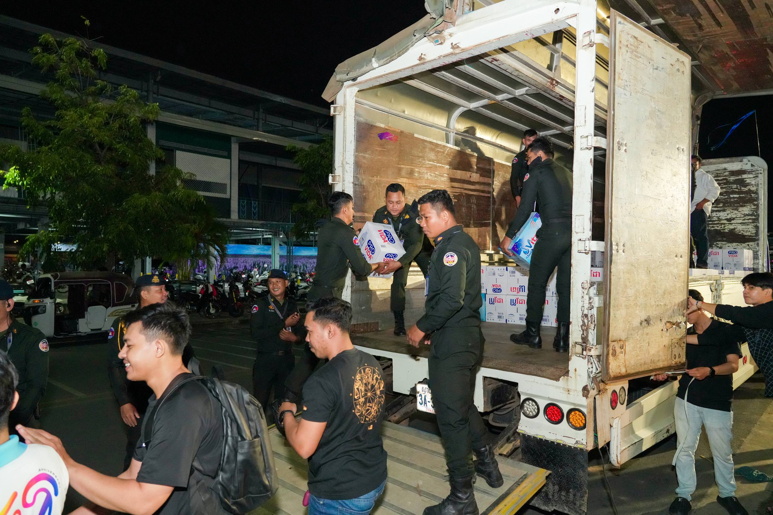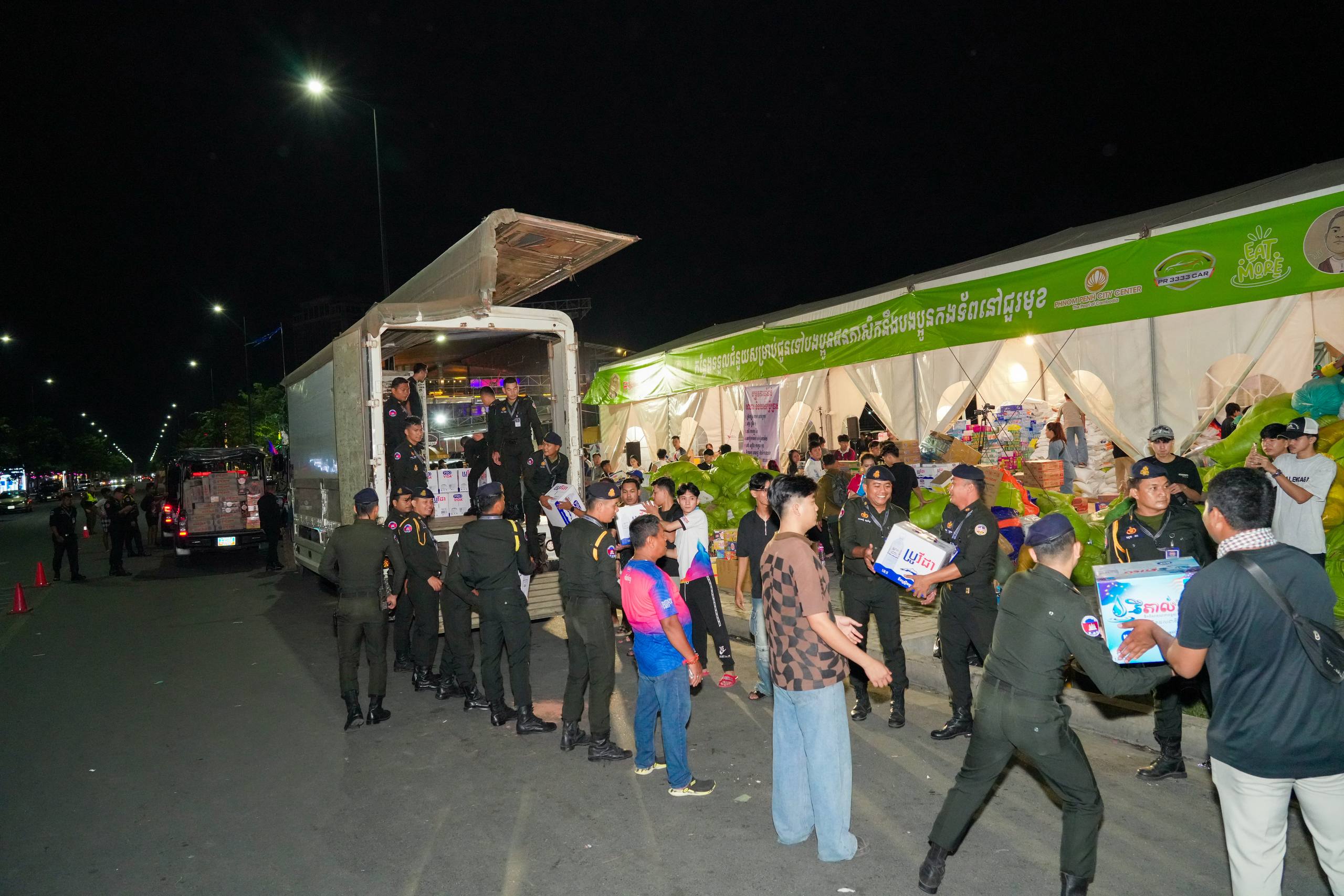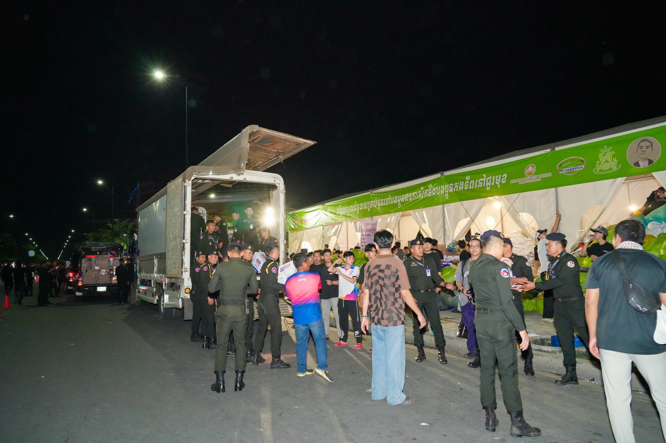 នៅយប់ថ្ងៃទី១០ ខែធ្នូ ឆ្នាំ២០២៥ កម្លាំងអាវុធហត្ថរាជធានីភ្នំពេញ បានចូលរួមជួយរៀបចំលើកជញ្ជូនស្បៀង និងសម្ភារៈចាំបាច់ផ្សេងៗ ចេញពីទីតាំងកន្លែងទទួលជំនួយសម្រាប់ជូនទៅបងប្អូនជនភៀសសឹក និងបងប្អូនកងទ័ពនៅជួរមុខ ត្រង់ចំណុច ហាង Eatmore បឹងកក់ រាជធានីភ្នំពេញ និងបានប្រើប្រាដ់រថយន្តជួយដឹកសំភារៈទៅឃ្លាំងស្តុករបស់ Eatmoreផងដែរ។
