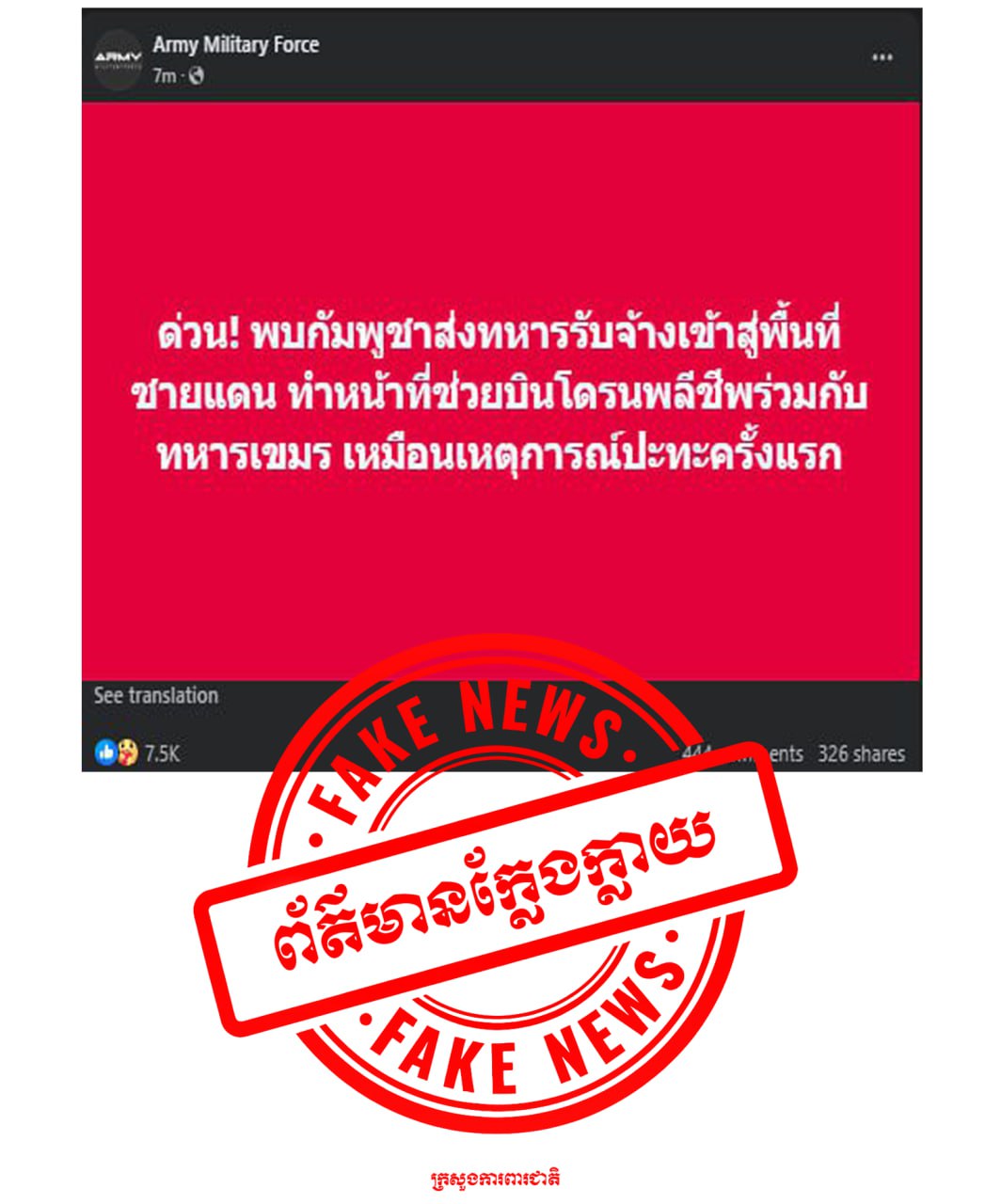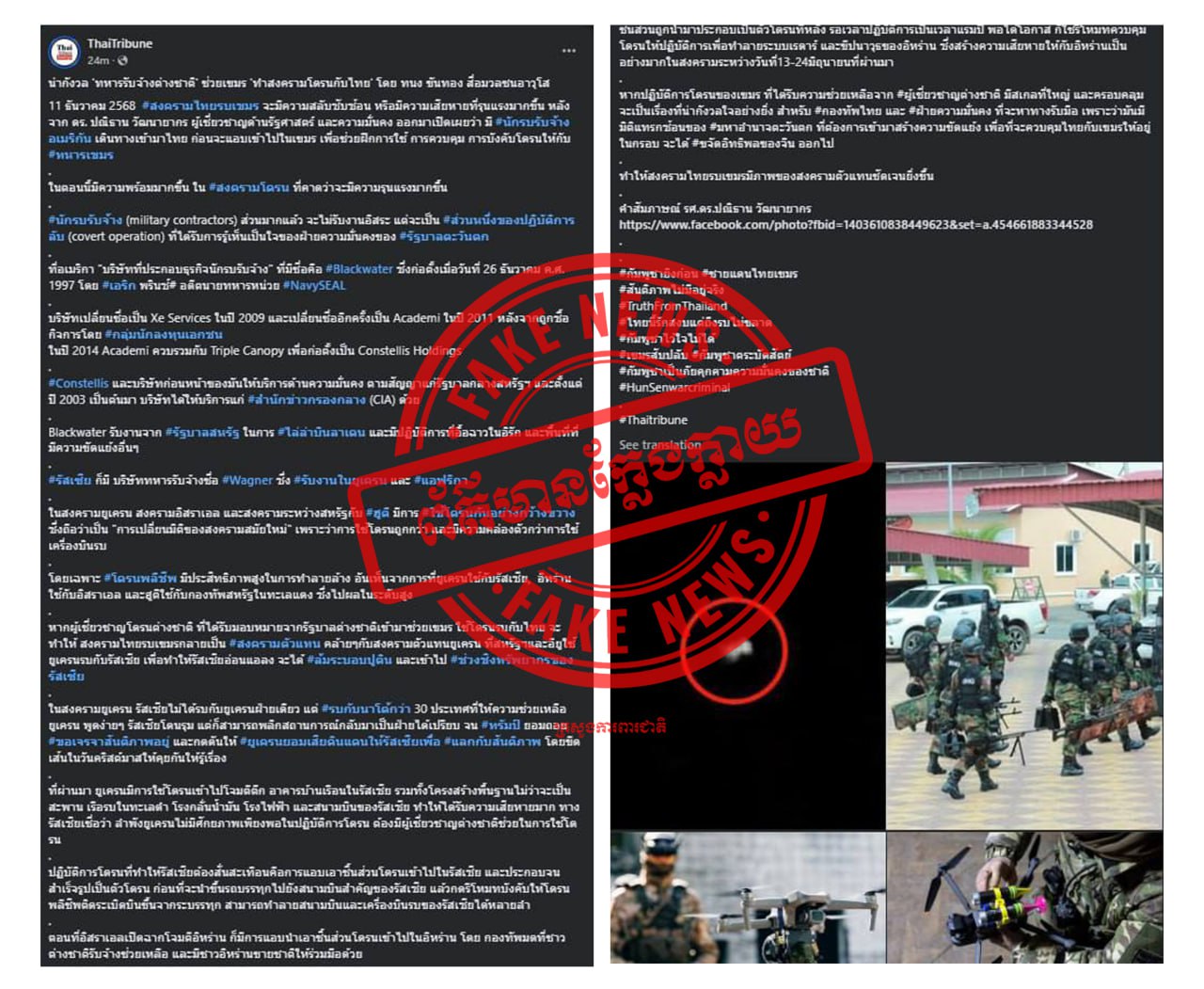 ការផ្សព្វផ្សាយរបស់សារព័ត៌មាន Thai Tribune និងផេកហ្វេសប៊ុក Army Military Force ដែលបានចោទប្រកាន់ថាកម្ពុជា ប្រើប្រាស់ទាហានស៊ីឈ្នួលបរទេសមកជួយបង្ហោះដ្រូនអត្តឃាតក្នុងជម្លោះព្រំដែនកម្ពុជា-ថៃ។ ក្រសួងការពារជាតិកម្ពុជា សូមទាត់ចោល នូវខ្លឹមសារដែលបានចុះផ្សាយក្នុងសារព័ត៌មានថៃខាងលើនេះ និងសូមអះអាងថាជាព័ត៌មានភូតកុហុក និងជាព័ត៌មានប្រឌិត ក្លែងក្លាយ និងលាបពណ៌មកលើកម្ពុជាតែប៉ុណ្ណោះ។