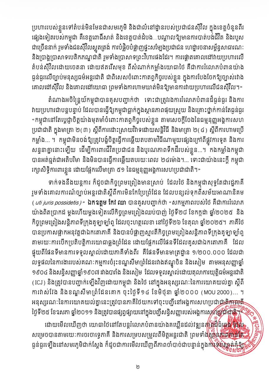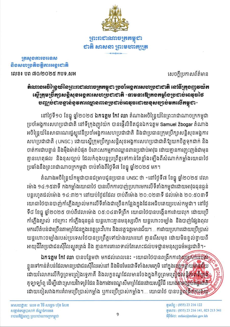 តំណាងអចិន្ត្រៃយ៍កម្ពុជាប្រចាំអង្គការសហប្រជាជាតិ ស្នើក្រុមប្រឹក្សាសន្តិសុខអង្គការសហប្រជាជាតិ «ទាមទារឱ្យកងកម្លាំងប្រដាប់អាវុធថៃបញ្ឈប់ជាបន្ទាន់នូវការឈ្លានពានប្រដាប់អាវុធដោយខុសច្បាប់មកលើកម្ពុជា»