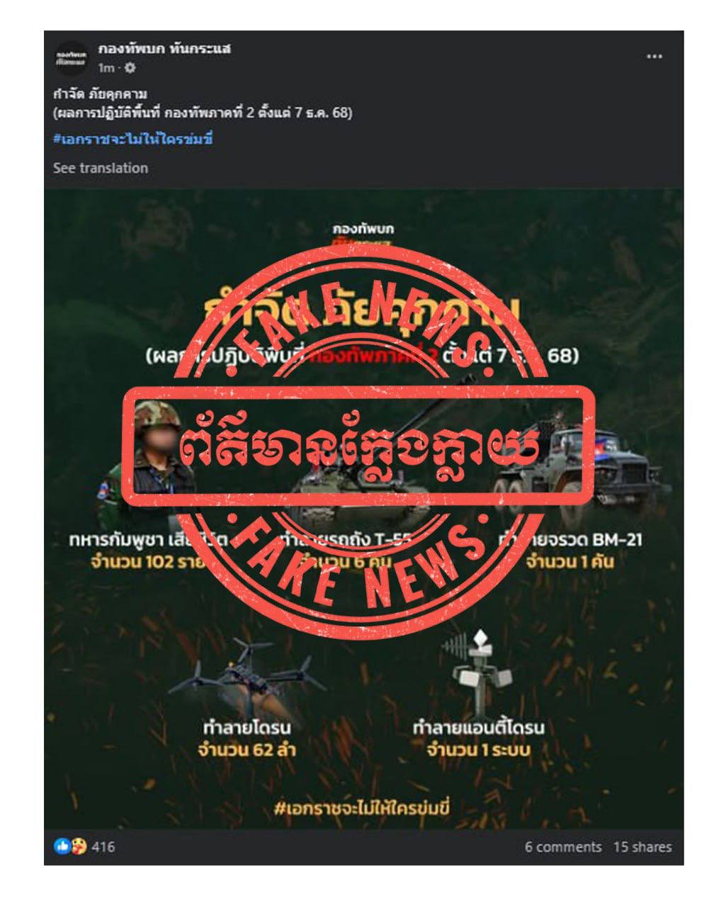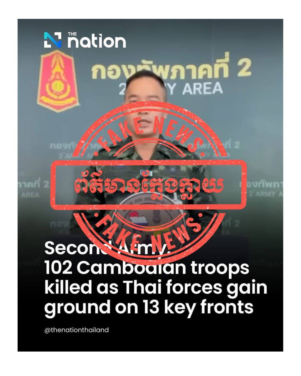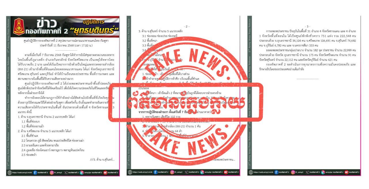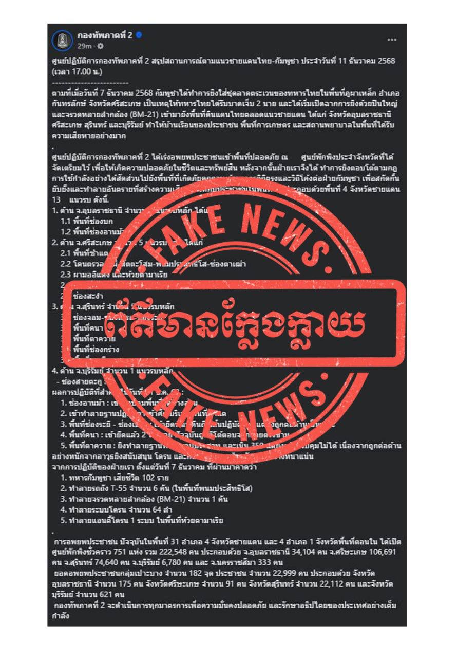 ការផ្សព្វផ្សាយរបស់ផេកមជ្ឈមណ្ឌលប្រតិបត្តិការយោធភូមិភាគទី២ ផេកកងទ័ពទាន់ហេតុការណ៍ និង ផេក The Nation Thailand ដែលបានចុះផ្សាយព័ត៌មានក្លែងក្លាយខុសពីការពិតទាំងស្រុង។ កម្ពុជាទាមទារឱ្យ ភាគីថៃបញ្ឈប់រាល់ការផ្សព្វផ្សាយព័ត៌មានមិនពិតដោយចេតនា ក្នុងគោលដៅបង្វែរសាធារណៈមតិជាតិ និងអន្តរជាតិឱ្យមានការភាន់ច្រលំ។
