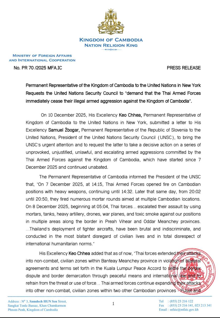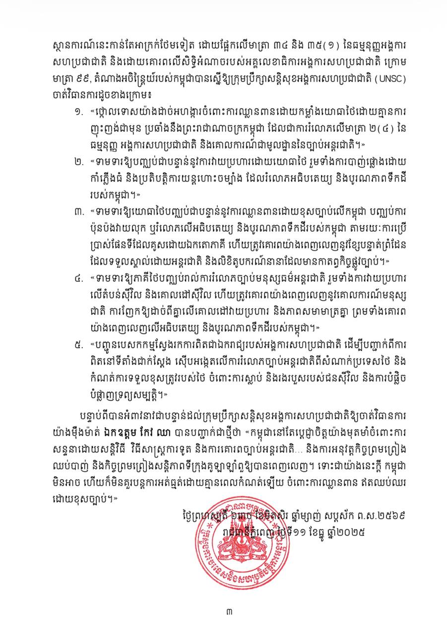 កម្ពុជា ប្រកាសថ្កោលទោសយ៉ាងដាច់អហង្ការចំពោះសកម្មភាពរបស់យោធាថៃ ដែលរំលោភលើច្បាប់អន្តរជាតិទាំងស្រុង បង្កវិនាសសកម្មធ្ងន់ធ្ងរ ប៉ះពាល់ដល់សណ្ដាប់ធ្នាប់ពិភពលោក ជាពិសេសបាត់បង់អាយុជីវិតជនស៊ីវិលស្លូតត្រង់។ កម្ពុជា ស្នើអង្គការអន្តរជាតិថ្កោលទោសសកម្មភាពរបស់យោធាថៃ ឱ្យបានគត់មត់ ដើម្បីស្ដារនូវសន្តិសុខក្នុងតំបន់ ក៏ដូចជាក្នុងពិភពលោកទាំងមូលផងដែរ៕