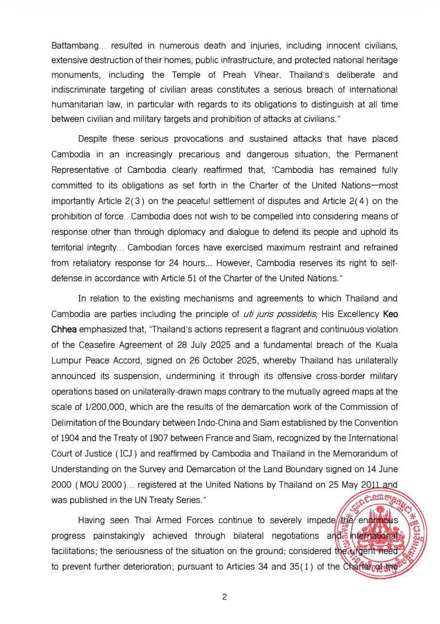 តំណាងអចិន្ត្រៃយ៍កម្ពុជាបានគូសបញ្ជាក់ថា ទោះជាត្រូវរងការរំលោភបំពានដ៏ធ្ងន់ធ្ងរ និងការ វាយប្រហារជាបន្តបន្ទាប់ ដែលបានធ្វើឱ្យកម្ពុជាធ្លាក់ក្នុងស្ថានភាពផុយស្រួយ និងគ្រោះថ្នាក់កាន់តែធ្ងន់ធ្ងរ «កម្ពុជានៅតែប្តេជ្ញាចិត្តយ៉ាងមុតមាំចំពោះកាតព្វកិច្ចរបស់ខ្លួន តាមសេចក្តីចែងនៃធម្មនុញ្ញអង្គការសហប្រជាជាតិ ក្នុងមាត្រា ២ (៣) ស្តីពីការដោះស្រាយវិវាទដោយសន្តិវិធី និងមាត្រា ២(៤) ស្តីពីការហាមប្រើ កម្លាំង…»។