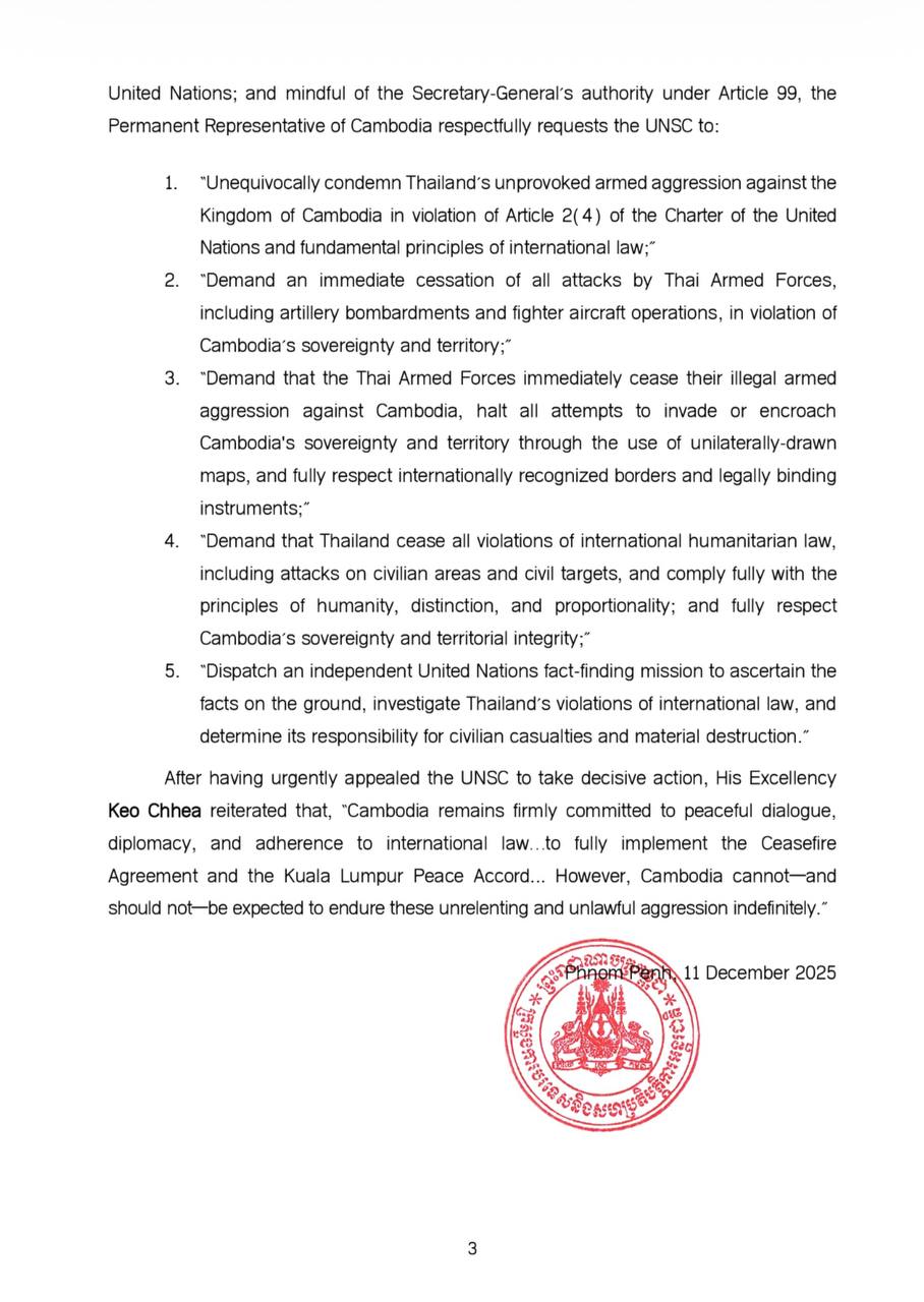 ការបាញ់មិនរើសគោលដៅរបស់ថៃ, កម្ពុជា ស្នើឱ្យក្រុមប្រឹក្សាសន្ដិសុខ UN កំណត់ការទទួលខុសត្រូវរបស់ថៃ ចំពោះការស្លាប់ និងរបួសជូនស៊ីវិល និងការបំផ្លាញទ្រព្យសម្បត្តិ