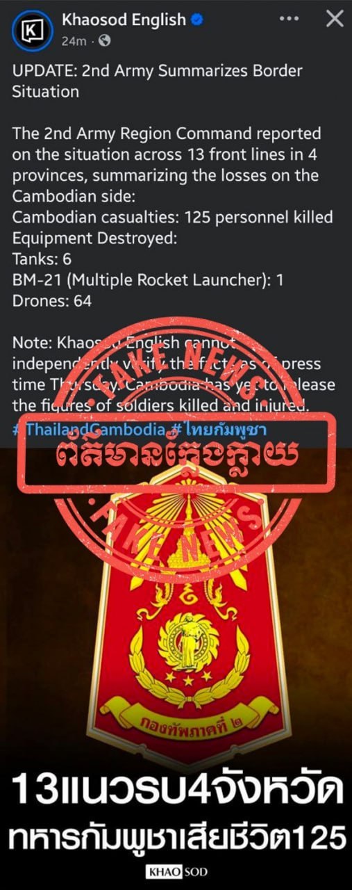 ការផ្សព្វផ្សាយរបស់ផេក Khaosod English ដែលបានចុះផ្សាយព័ត៌មានក្លែងក្លាយខុសពីការពិតទាំងស្រុង។ កម្ពុជាទាមទារឱ្យ ភាគីថៃបញ្ឈប់រាល់ការផ្សព្វផ្សាយព័ត៌មានមិនពិតដោយចេតនា ក្នុងគោលដៅបង្វែរសាធារណៈមតិជាតិ និងអន្តរជាតិឱ្យមានការភាន់ច្រលំ។