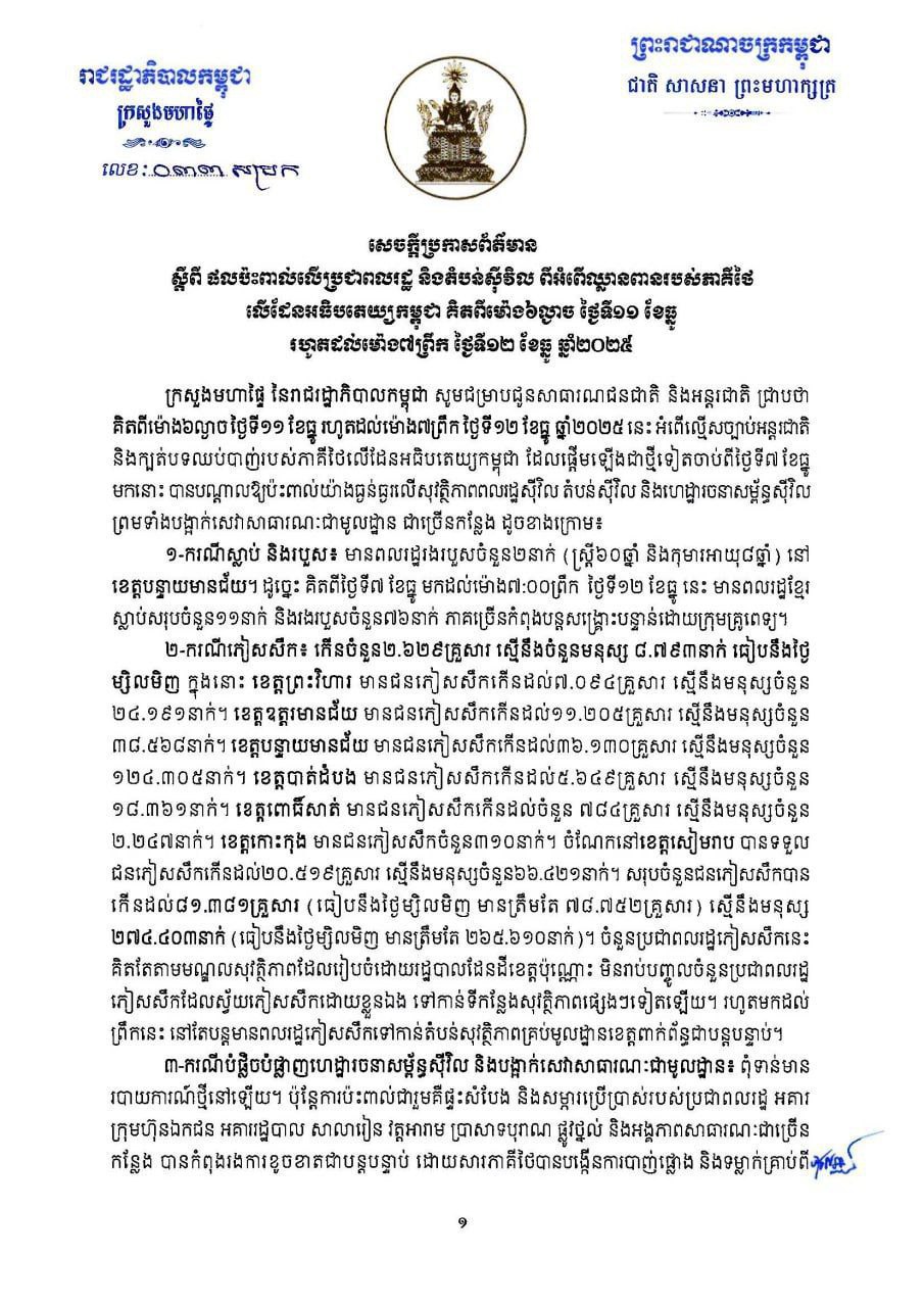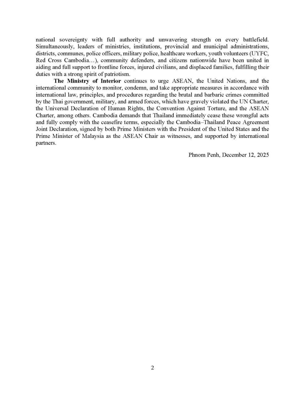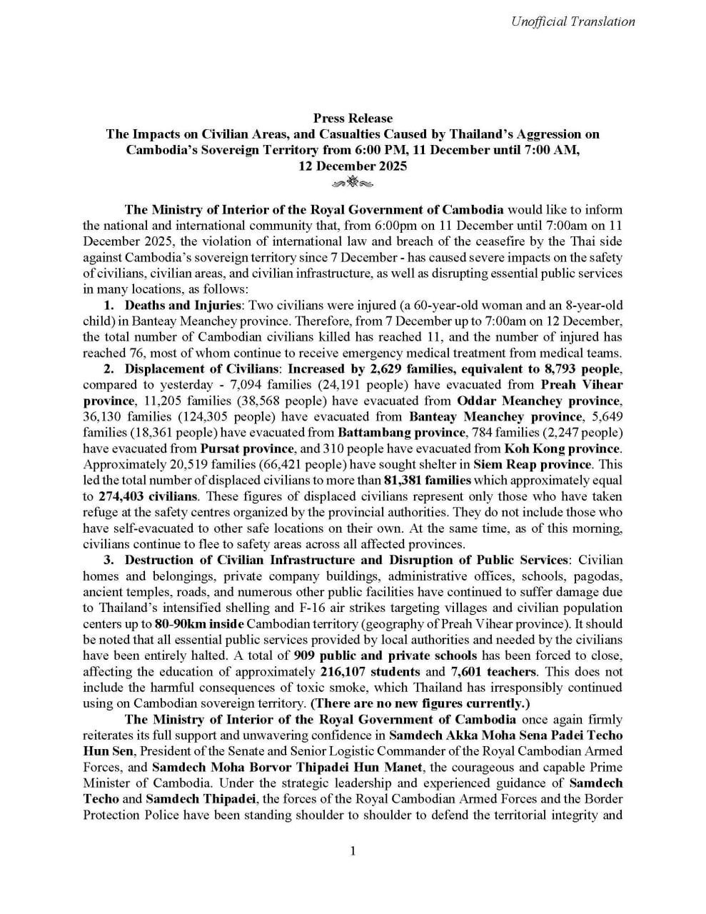(ភ្នំពេញ)៖ ក្រសួងមហាផ្ទៃ នៅថ្ងៃទី១២ ខែធ្នូ ឆ្នាំ២០២៥នេះ បានចេញសេចក្ដីប្រកាសព័ត៌មាន បច្ចុប្បន្នភាពនៃផលប៉ះពាល់លើប្រជាពលរដ្ឋ និងតំបន់ស៊ីវិល ពីអំពើឈ្លានពានរបស់ភាគីថៃ លើដែនអធិបតេយ្យកម្ពុជា គិតពីម៉ោង៦ល្ងាច ថ្ងៃទី១១ ខែធ្នូ រហូតដល់ម៉ោង៧ព្រឹក ថ្ងៃទី១២ ខែធ្នូ ឆ្នាំ២០២៥។