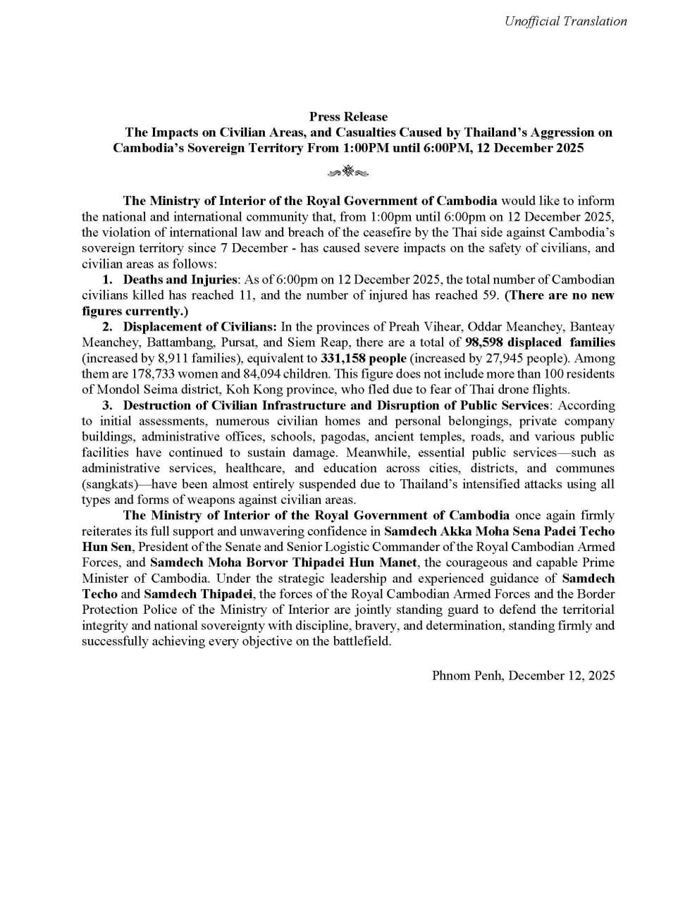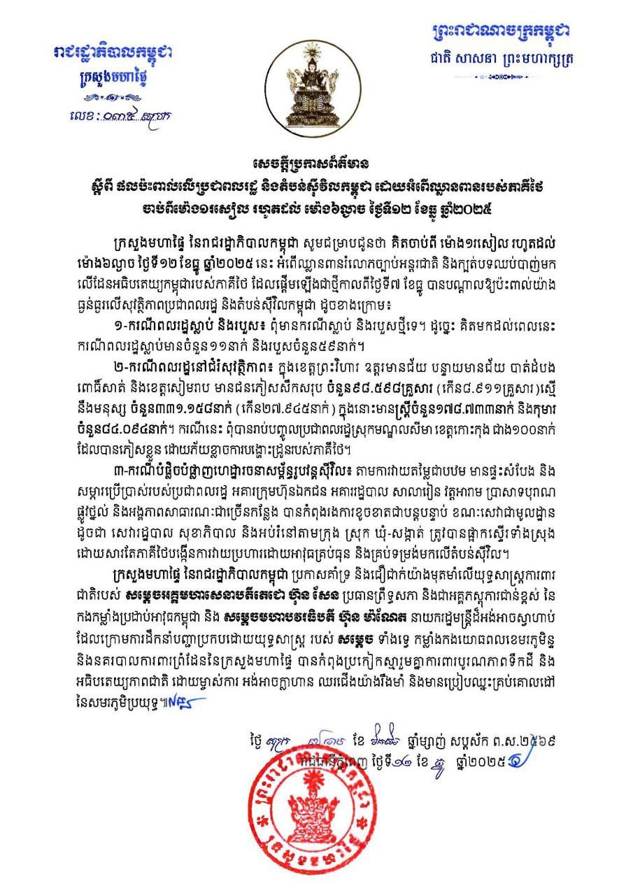 (ភ្នំពេញ)៖ ក្រសួងមហាផ្ទៃ បានបន្ដសេចក្ដីប្រកាសព័ត៌មានបង្ហាញអំពីផលប៉ះពាល់លើប្រជាពលរដ្ឋ និងតំបន់ស៊ីវិលកម្ពុជា ដោយអំពើឈ្លានពានរបស់ភាគីថ ចាប់ពីម៉ោង១រសៀល រហូតដល់ ម៉ោង៦ល្ងាច ថ្ងៃទី១២ ខែធ្នូ ឆ្នាំ២០២៥។