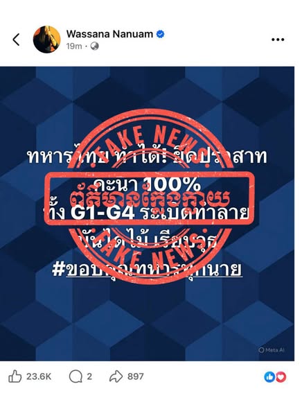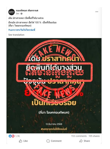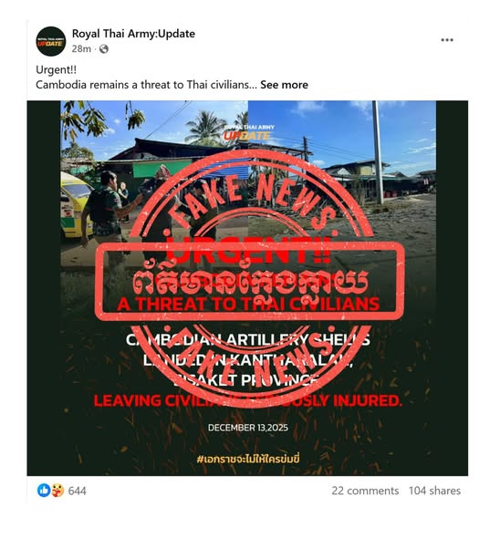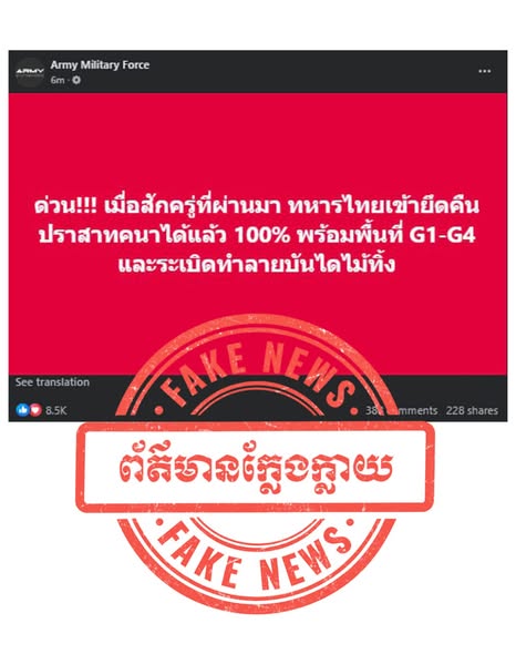 ការផ្សព្វផ្សាយរបស់ផេក Army Military Force Wassana Nanuam និង កងទ័ពទាន់ហេតុការណ៍ គឺជាព័ត៌មានក្លែងក្លាយ បំភ្លៃកាពិត