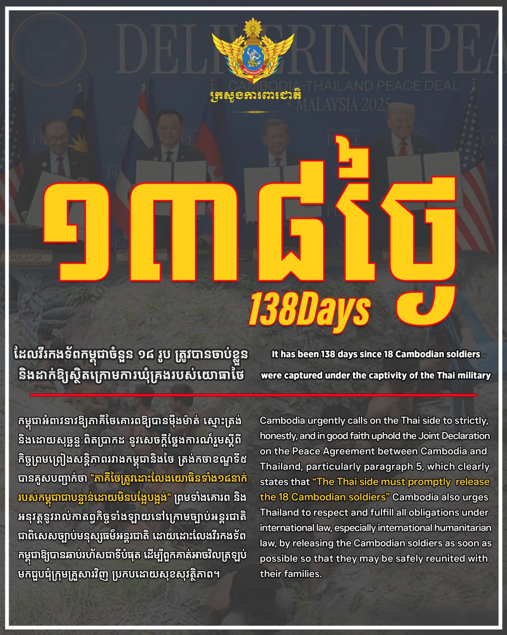 កម្ពុជាអំពាវនាវឱ្យភាគីថៃគោរពឱ្យបានម៉ឺងម៉ាត់ ស្មោះត្រង់ និងដោយសុច្ឆន្ទៈពិតប្រាកដ នូវសេចក្តីថ្លែងការណ៍រួមស្តីពីកិច្ចព្រមព្រៀងសន្តិភាពរវាងកម្ពុជានិងថៃ ត្រង់កថាខណ្ឌទី៥ បានគូសបញ្ជាក់ថា “ភាគីថៃត្រូវដោះលែងយោធិនទាំង១៨នាក់របស់កម្ពុជាជាបន្ទាន់ដោយមិនបង្អែបង្អង់” ព្រមទាំងគោរពនិងអនុវត្តនូវរាល់កាតព្វកិច្ចទាំងឡាយនៅក្រោមច្បាប់អន្តរជាតិ ជាពិសេសច្បាប់មនុស្សធម៌អន្តរជាតិ ដោយដោះលែងវីរកងទ័ពកម្ពុជាឱ្យបានឆាប់រហ័សជាទីបំផុត ដើម្បីពួកគាត់អាចវិលត្រឡប់មកជួបជុំក្រុមគ្រួសារវិញ ប្រកបដោយសុខសុវត្ថិភាព។