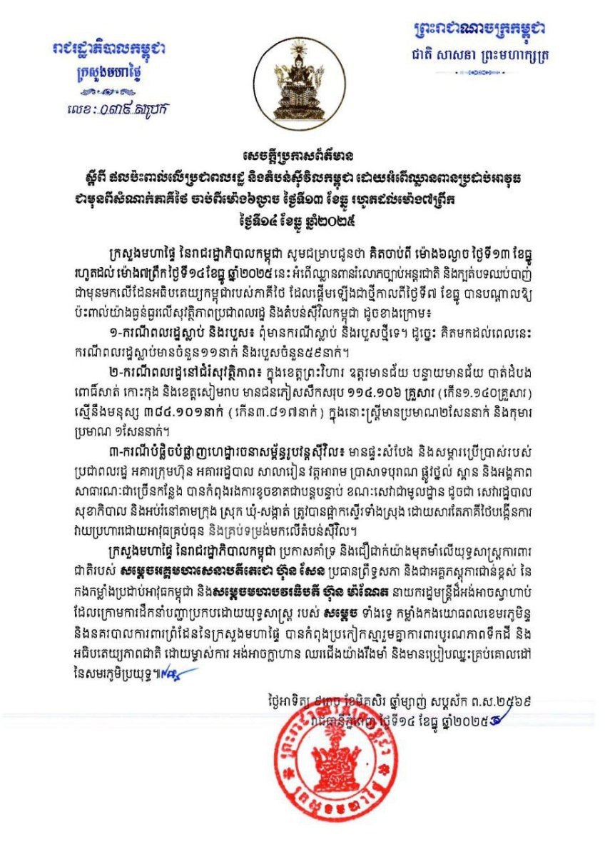 យោងតាម សេចក្តីប្រកាសព័ត៌មាន ស្តីពីផលប៉ះពាល់លើប្រជាពលរដ្ឋ និងតំបន់ស៊ីវិលកម្ពុជា ដោយអំពើឈ្លានពានប្រដាប់អាវុធ ជាមុនពីសំណាក់ភាគីថៃចាប់ពីម៉ោង៦ល្ងាច ថ្ងៃទី១៣ ខែធ្នូ រហូតដល់ម៉ោង៧ព្រឹក ថ្ងៃទី១៤ ខែធ្នូ ឆ្នាំ២០២៥ របស់ក្រសួងមហាផ្ទៃ នៃរាជរដ្ឋាភិបាលកម្ពុជា បានឱ្យដឹងថា ពលរដ្ឋស៊ីវិលស្លាប់កម្ពុជាស្លាប់មានចំនួន ១១ នាក់ និងរបួសចំនួន៥៩នាក់។ ខណៈមកទល់ពេលនេះ ពលរដ្ឋកំពុងភៀសសឹកនៅជំរំសុវត្ថិភាព៖ ក្នុងខេត្តព្រះវិហារ ឧត្តរមានជ័យ បន្ទាយមានជ័យ បាត់ដំបង ពោធិ៍សាត់ កោះកុង និងខេត្តសៀមរាប មានជនភៀសសឹកសរុប ១១៤.១០៦ គ្រួសារ (កើន១.១៤០គ្រួសារ) ស្មើនឹងមនុស្ស ៣៨៤.១០១ នាក់ (កើន៣.៨១៧នាក់) ក្នុងនោះស្ត្រីមានប្រមាណ២សែននាក់ និងកុមារប្រមាណ ១សែននាក់។