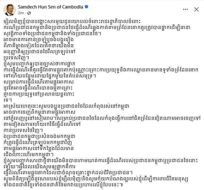 សម្ដេចតេជោបានសរសេរថា ម្សិលមិញខ្ញុំបានបង្ហោះសារមួយជូនយោបល់ចំពោះរាជរដ្ឋាភិបាលចំពោះ ករណីប្រជាជនកម្ពុជា និងប្រជាជនថៃធ្វើដំណើរឆ្លងកាត់តាមព្រំដែនគោកគួរត្រូវបានផ្អាកដើម្បីធានាសុវត្តិភាពទាំងប្រជាជនកម្ពុជា និងទាំងប្រជាជនថៃ។ អាចមានការភាន់ច្រឡំ ឬចង់បង្កររឿងពីភាគីម្ខាងទៀតដែលគិតថាយើងមិនអនុញ្ញាតឲ្យប្រជាជនថៃវិលត្រឡប់ទៅប្រទេសវិញ។