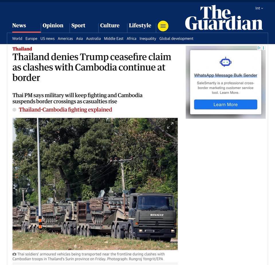 ភ្នំពេញ ៖ វត្តមានរបស់អ្នកសារព័ត៌មានជាតិនិងអន្តរជាតិនៅតាមបណ្តោយព្រំដែនបាននាំយកការពិតពីកម្ពុជាដល់ពិភពលោក! ទីភ្នាក់សារព័ត៌មានអន្តរជាតិនានាបង្ហាញវត្តមាននៅកម្ពុជាក្នុងអំឡុងពេលយោធាថៃធ្វើសកម្មភាពឈ្លានពានប្រដាប់អាវុធមកលើកម្ពុជា។ សូមអរគុណទីភ្នាក់ងារសារព័ត៌មានបារាំង AFP, AP, Reuters, EPA, Xinhua, CNA, Aljazeera, Phonex និងបណ្តាញសារព័ត៌មានអន្តរជាតិផ្សេងទៀតដែលបានផ្សព្វផ្សាយអត្ថបទពីទីភ្នាក់ងារសារព័ត៌មានធំៗ ដូចជា CNN, France 24, Le Monde, BBC, Bloomberg, Wall Street Journal, The Guardian, The Times, The Independent ជាដើម ជាពិសេសអ្នកសារព័ត៌មានជាតិកម្ពុជានានា ដែលបានចុះយកព័ត៌មានយ៉ាងសស្រាក់សស្រាំនៅតាមបណ្តាខេត្តដែលជាសមរភូមិប្រយុទ្ធ។ វិទ្យុនិងទូរទស្សន៍ជាតិកម្ពុជា ទីភ្នាក់ងារសារព័ត៌មានកម្ពុជា AKP ដើរតួនាទីមជ្ឈមណ្ឌលកណ្តាលផ្តល់ព័ត៌មានពីសមរភូមិមុខ។ ស្ថានីយវិទ្យុទូរទស្សន៍ឯកជន ប្រព័ន្ធផ្សព្វផ្សាយបែបថ្មីផ្សេងទៀត បានចូលរួមយ៉ាងសកម្មក្នុងការផ្តល់ព័ត៌មាន រួមទាំងអ្នកសារព័ត៌មានគ្មានអង្គភាព អ្នកមានឥទ្ធិពលក្នុងសង្គម និងអ្នកលេងបណ្តាញសង្គម។