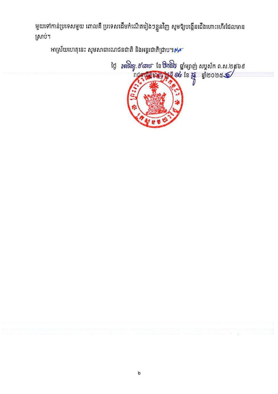 ក្រសួងមហាផ្ទៃ នៃរាជរដ្ឋាភិបាលកម្ពុជា ចេញសេចក្ដីប្រកាសច្រានចោលការបំភាន់ និងមួលបង្កាច់ របស់ភាគីថៃ លើការសម្រេចផ្អាកការធ្វើដំណើរឆ្លងកាត់ព្រំដែនកម្ពុជាជាប់ជាមួយថៃ