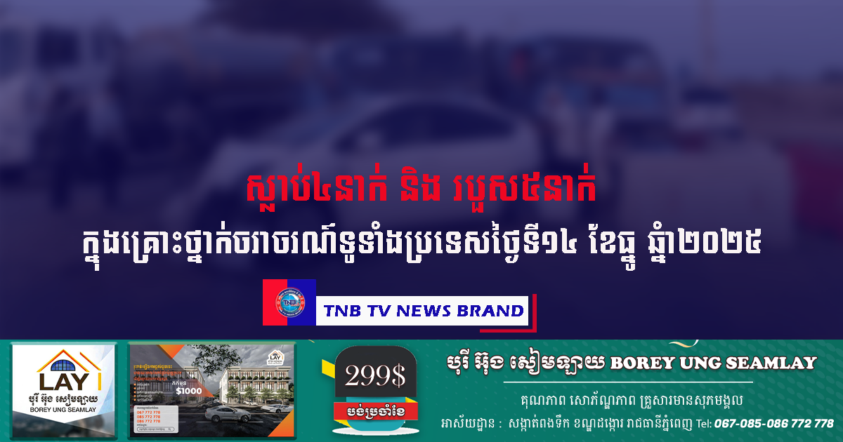 ស្លាប់៤នាក់ និងរបួស៥នាក់ ក្នុងគ្រោះថ្នាក់ចរាចរណ៍ទូទាំងប្រទេសថ្ងៃទី១៤ ខែធ្នូ ឆ្នំា២០២៥