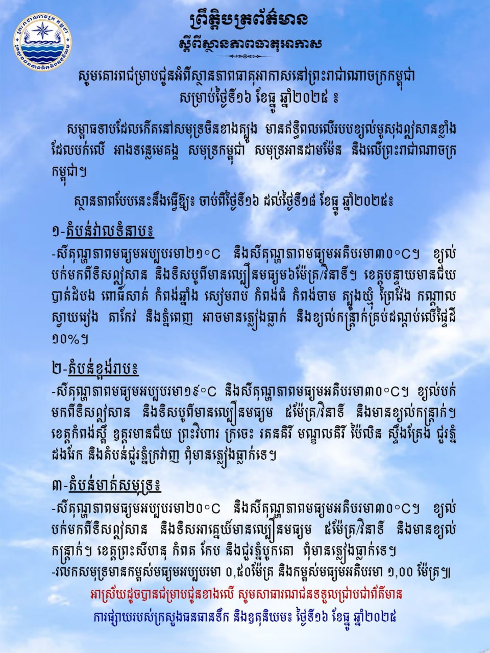 ក្រសួងធនធានទឹក ជូនដំណឹងអំពីស្ថានភាពធាតុអាកាសនៅកម្ពុជា សម្រាប់ថ្ងៃទី១៦ ខែធ្នូ ឆ្នាំ២០២៥
