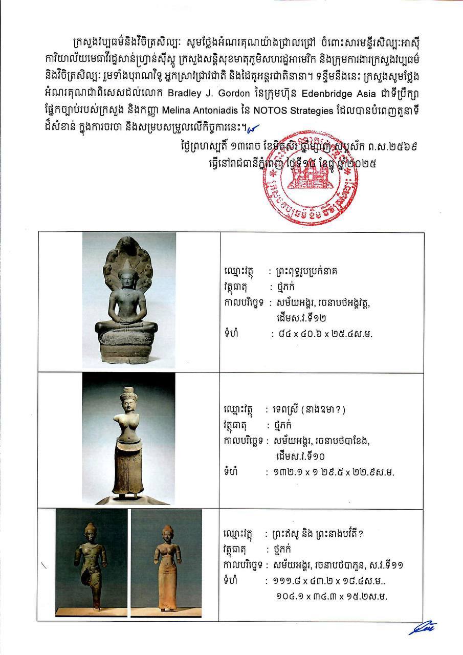 ក្រសួងបញ្ជាក់ថា ការសម្រេចជាផ្លូវការនេះធ្វើឡើងបន្ទាប់ពី គណៈកម្មការសិល្បៈ អាស៊ីបានបោះឆ្នោតយល់ព្រមជាឯកច្ឆន្ទ កាលពីថ្ងៃទី២៤ ខែកញ្ញា ឆ្នាំ២០២៥ ដោយបញ្ជាក់ថា វត្ថុបុរាណខ្មែរដ៏វិចិត្រទាំង៣៣រូប បាននាំចេញពីកម្ពុជាដោយខុសច្បាប់ ដែលជាការបំពានលើច្បាប់សហព័ន្ធ និងផ្អែកលើភស្តុតាងនានា ដែលរកឃើញដោយភ្នាក់ងារសន្តិសុខមាតុភូមិសហរដ្ឋអាមេរិក រួមទាំងក្រុមស្រាវ ជ្រាវកម្ពុជា និងក្រុមការងារសារមន្ទីរសិល្បៈអាស៊ី៕