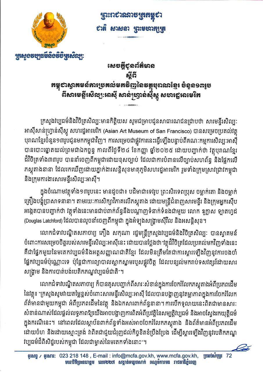 (ភ្នំពេញ)៖ ក្រសួងវប្បធម៌ និងវិចិត្រសិល្បៈកម្ពុជា នៅថ្ងៃទី១៨ ខែធ្នូ ឆ្នាំ២០២៥នេះ បានចេញសេចក្តីប្រកាសព័ត៌មានដោយបញ្ជាក់ថា សារមន្ទីរសិល្បៈអាស៊ីសាន់ហ្រ្វាន់ស៊ីស្កូ សហរដ្ឋអាមេរិក (Asian Art Museum of San Francisco) ប្រគល់វត្ថុបុរាណខ្មែរចំនួន១៣រូបជូនមក កម្ពុជាវិញ។