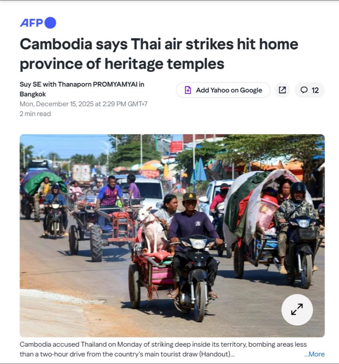 លោករដ្ឋមន្ត្រី បានបន្ដថា អំឡុងពេលនៃការទម្លាក់គ្រាប់បែកចូលជ្រៅមកក្នុងទឹកដីកម្ពុជា ទីភ្នាក់សារព័ត៌មាន AFP បានផ្សាយព័ត៌មាននេះដើម្បីឱ្យពិភពលោកបានដឹង ដោយដកស្រង់សម្តីរបស់មន្ត្រីកម្ពុជាមកផ្សព្វផ្សាយ«លើកទី១ ដែលយោធាថៃបានវាយប្រហារចូលជ្រៅក្នុងទឹកដីកម្ពុជាដែលមិនមែនជាទីតាំងជម្លោះព្រំដែន និងទម្លាក់គ្រាប់ក្បែរជំរុំជនភៀសសឹកដែលជាប្រជាពលរដ្ឋស្លូតត្រង់។