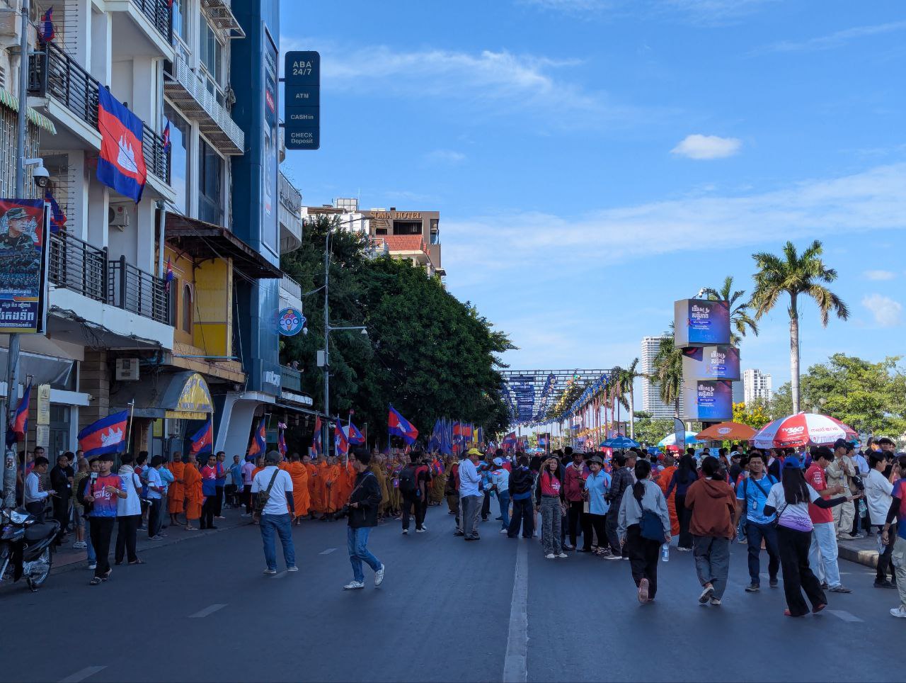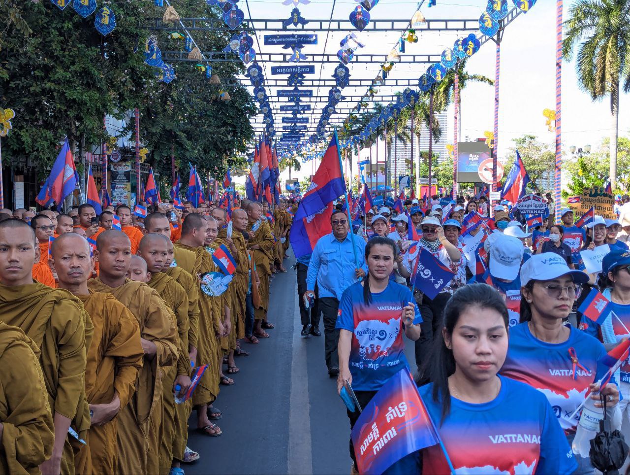 ទិដ្ឋភាព ព្រះសង្ឃ និងប្រជាពលរដ្ឋ និមន្ត និងអញ្ជើញមកចូលរួមកម្មវិធីដើរដើម្បីសន្ដិភាព (March for Peace) ក្នុងគោលបំណងដើម្បីបង្ហាញស្មារតីស្រឡាញ់សន្ដិភាពរបស់ព្រះរាជាណាចក្រកម្ពុជាជាពិសេសជំរុញឱ្យមានការគោរពបទឈប់បាញ់ និងកិច្ចព្រមព្រៀងសន្ដិភាព រវាងព្រះរាជាណាចក្រកម្ពុជា និងព្រះរាជាណាចក្រថៃ នៅរសៀលថ្ងៃទី១៨ ខែធ្នូ ឆ្នាំ២០២៥នេះ នៅបរិវេណផ្សាររាត្រី។