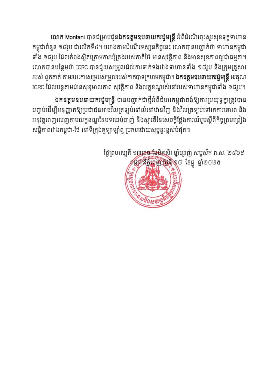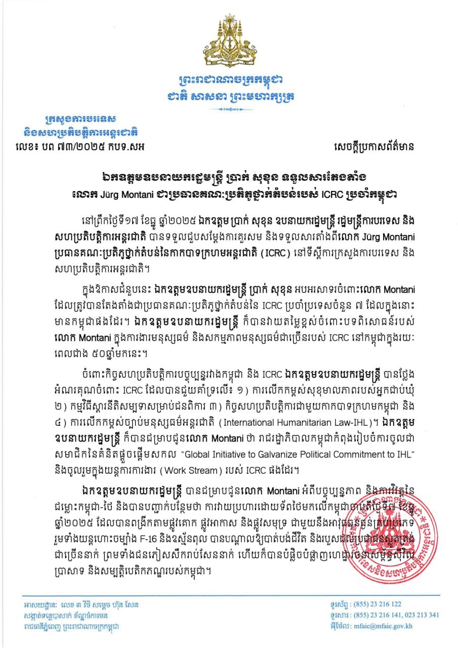 ឯកឧត្តមឧបនាយករដ្ឋមន្ត្រីប្រាក់ សុខុន ទទួលសារតែងតាំង លោក Jürg Montani ជាប្រធានគណៈប្រតិភូថ្នាក់តំបន់របស់ ICRC ប្រចាំកម្ពុជា