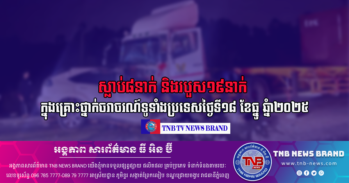 ស្លាប់៨នាក់ និងរបួស១៩នាក់ ក្នុងគ្រោះថ្នាក់ចរាចរណ៍ទូទាំងប្រទេសថ្ងៃទី១៨ ខែធ្នូ ឆ្នំា២០២៥
