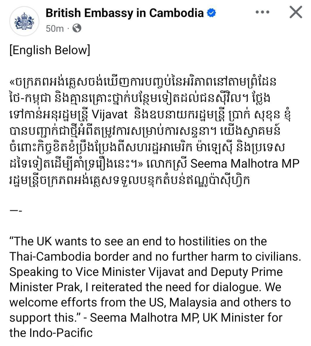 នៅក្នុងសារមួយដែលបង្ហោះលើបណ្តាញសង្គម X លោកស្រី Malhotra បានបញ្ជាក់ថា «ចក្រភពអង់គ្លេសចង់ឃើញការបញ្ចប់អរិភាពនៅតាមព្រំដែនថៃ-កម្ពុជា និងមិនឱ្យមានគ្រោះថ្នាក់ដល់ជនស៊ីវិលតទៅទៀតទេ»។