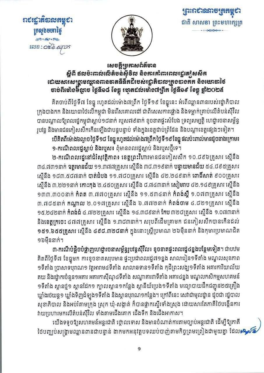 (ភ្នំពេញ)៖ ក្រសួងមហាផ្ទៃ បានឲ្យដឹងថា មកទល់ព្រឹកថ្ងៃទី១៩ ខែធ្នូ ឆ្នាំ២០២៥នេះ អំពើឈ្លានពានរបស់រដ្ឋាភិបាលក្រុងបាងកក និងយោធាថៃលើកម្ពុជា មិនរើសគោលដៅ ជាពិសេសការផ្លោង និងទម្លាក់គ្រាប់លើតំបន់ស៊ីវិល បានបណ្តាលឲ្យពលរដ្ឋកម្ពុជាស្លាប់១៨នាក់ របួស៧៩នាក់ ខូចខាតផ្ទះសំបែង ទ្រព្យសម្បត្តិ ហេដ្ឋារចនាសម្ព័ន្ធ រូបវន្ត និងមានជនភៀសសឹកកើនឡើងជាបន្តបន្ទាប់ ទាំងក្នុងខេត្តជាប់ព្រំដែន និងបណ្តាខេត្តផ្សេងៗទៀត។