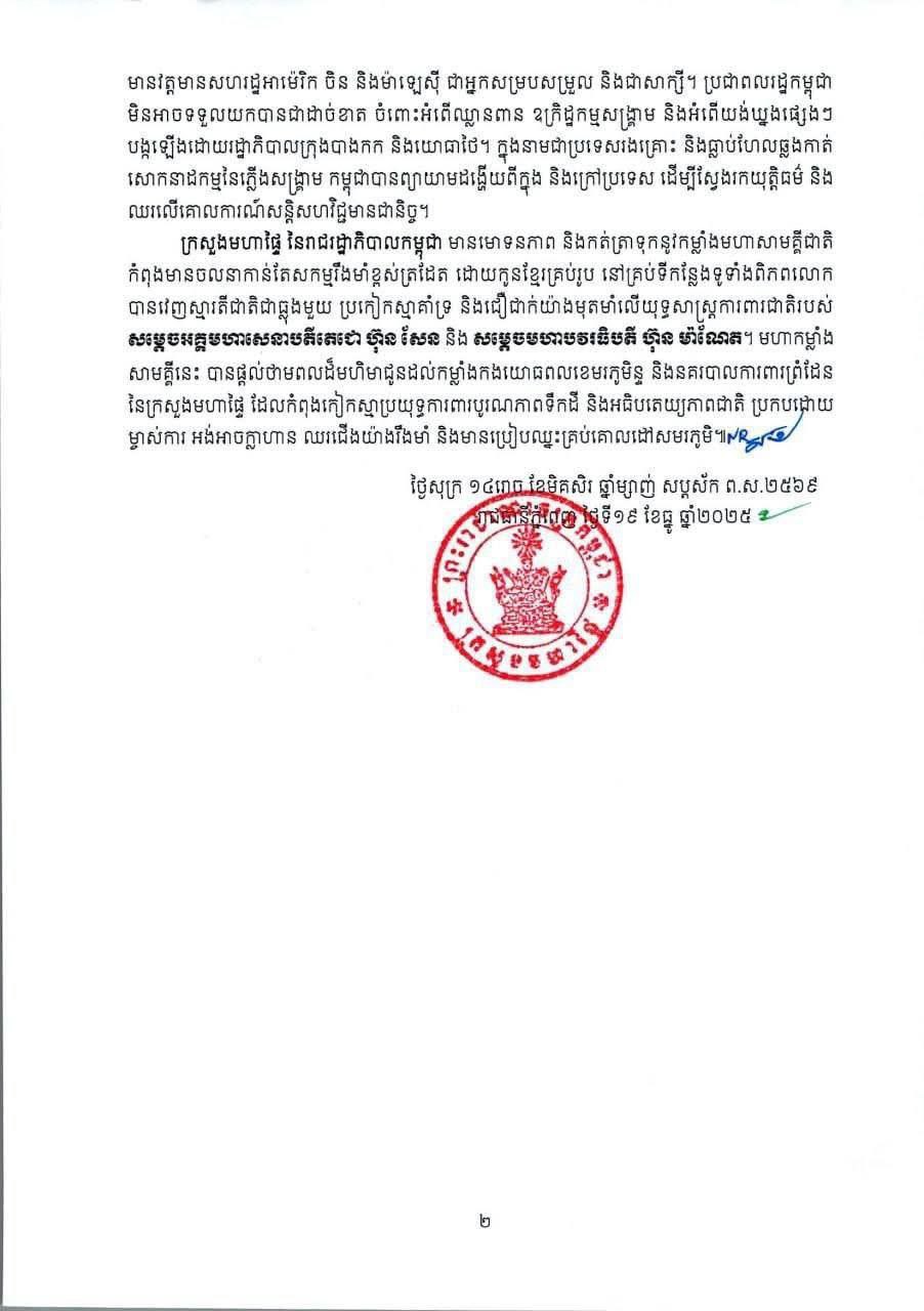 ខាងក្រោមនេះ ជាសេចក្ដីប្រកាសព័ត៌មានរបស់ក្រសួងមហាផ្ទៃ៖