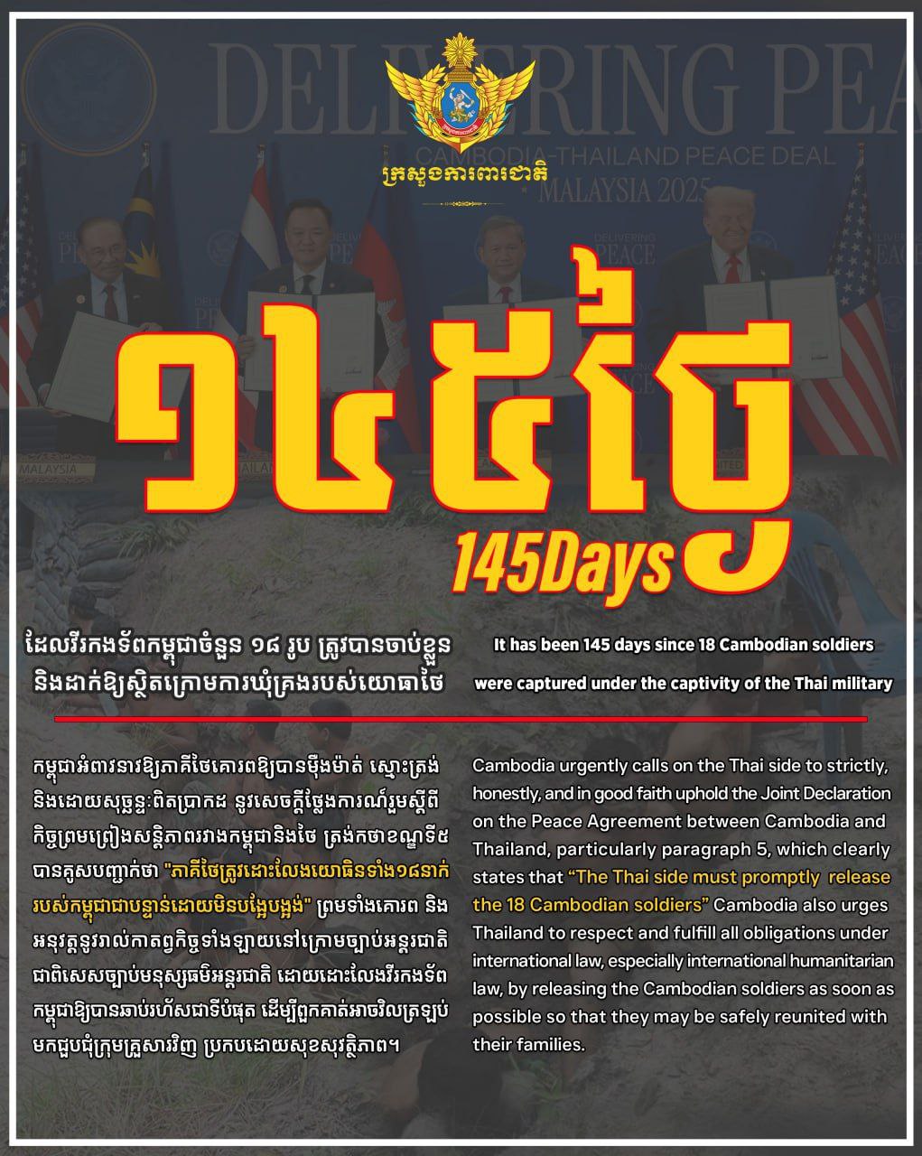 កម្ពុជាអំពាវនាវឱ្យភាគីថៃគោរពឱ្យបានម៉ឺងម៉ាត់ ស្មោះត្រង់ និងដោយសុច្ឆន្ទៈពិតប្រាកដ នូវសេចក្តីថ្លែងការណ៍រួមស្តីពីកិច្ចព្រមព្រៀងសន្តិភាពរវាងកម្ពុជានិងថៃ ត្រង់កថាខណ្ឌទី៥ បានគូសបញ្ជាក់ថា “ភាគីថៃត្រូវដោះលែងយោធិនទាំង១៨នាក់របស់កម្ពុជាជាបន្ទាន់ដោយមិនបង្អែបង្អង់” ព្រមទាំងគោរពនិងអនុវត្តនូវរាល់កាតព្វកិច្ចទាំងឡាយនៅក្រោមច្បាប់អន្តរជាតិ ជាពិសេសច្បាប់មនុស្សធម៌អន្តរជាតិ ដោយដោះលែងវីរកងទ័ពកម្ពុជាឱ្យបានឆាប់រហ័សជាទីបំផុត ដើម្បីពួកគាត់អាចវិលត្រឡប់មកជួបជុំក្រុមគ្រួសារវិញ ប្រកបដោយសុខសុវត្ថិភាព។