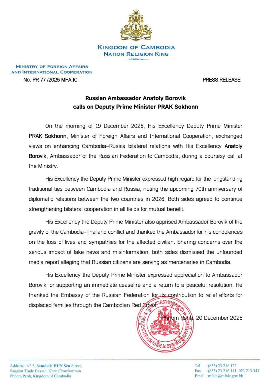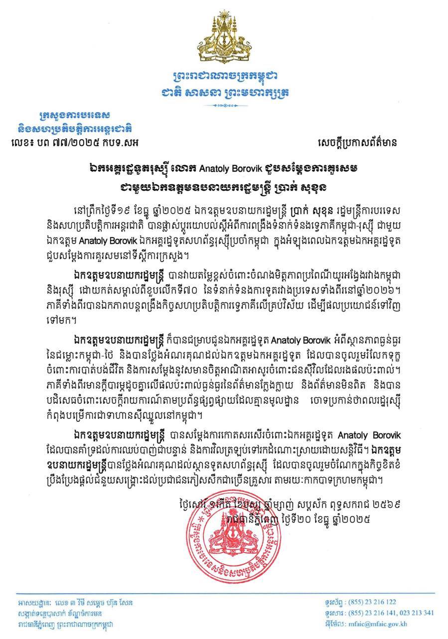 ការប្រកាសបដិសេធជាថ្មីនេះធ្វើឡើងក្នុងឱកាស ឯកឧត្តមឧបនាយករដ្ឋមន្ត្រី ប្រាក់ សុខុន រដ្ឋមន្ត្រីការបរទេស និងសហប្រតិបត្តិការអន្តរជាតិ ទទួលជំនួបផ្លាស់ប្តូរយោបល់ស្តីអំពីការពង្រឹងទំនាក់ទំនងទ្វេភាគីកម្ពុជា-រុស្ស៊ី ជាមួយ ឯកឧត្តម Anatoly Borovik ឯកអគ្គរដ្ឋទូតសហព័ន្ធរុស្ស៊ីប្រចាំកម្ពុជា ក្នុងអំឡុងពេលឯកឧត្តមឯកអគ្គរដ្ឋទូត ជួបសម្តែងការគួរសមនៅទីស្តីការក្រសួង កាលពីថ្ងៃទី១៩ ខែធ្នូ ឆ្នាំ២០២៥នេះ។