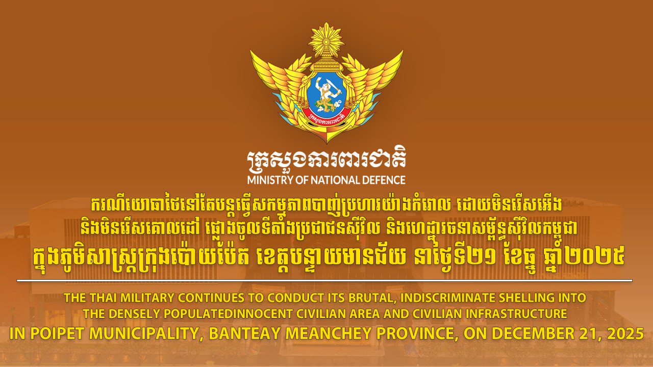 ករណីយោធាថៃនៅតែបន្តធ្វើសកម្មភាពបាញ់ប្រហារយ៉ាងកំរោល ដោយមិនរើសអើង និងមិនរើសគោលដៅ ផ្លោងចូលទីតាំងប្រជាជនស៊ីវិល និងហេដ្ឋារចនាសម្ព័ន្ធស៊ីវិលកម្ពុជាក្នុងភូមិសាស្រ្តក្រុងប៉ោយប៉ែត ខេត្តបន្ទាយមានជ័យ នាថ្ងៃទី២១ ខែធ្នូ ឆ្នាំ២០២៥៖
