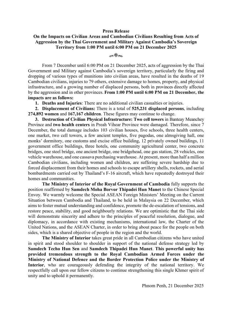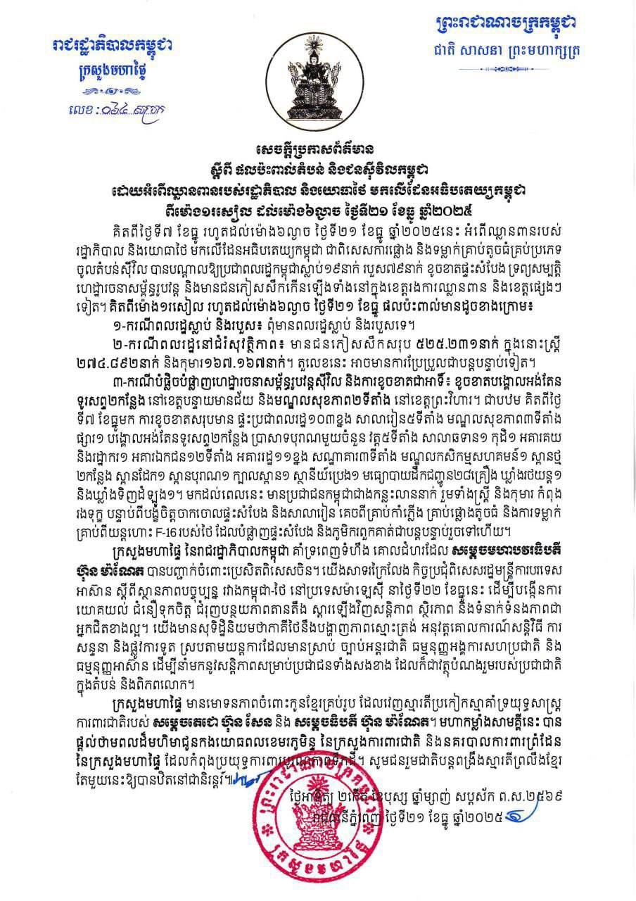 ក្រសួងមហាផ្ទៃ នៃរាជរដ្ឋាភិបាលកម្ពុជា ចេញសេចក្ដីប្រកាសព័ត៌មានស្ដីពី ផលប៉ះពាល់តំបន់ និងជនស៊ីវិលកម្ពុជា ដោយអំពើឈ្លានពានរបស់រដ្ឋាភិបាល និងយោធាថៃ មកលើដែនអធិបតេយ្យកម្ពុជា ពីម៉ោង១រសៀល ដល់ម៉ោង៦ល្ងាច ថ្ងៃទី២១ ខែធ្នូ ឆ្នាំ២០២៥។