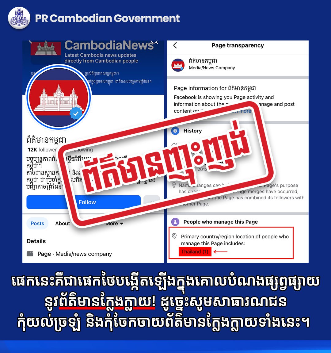 ផេកនេះគឺជាផេកថៃបង្កើតឡើងក្នុងគោលបំណងផ្សព្វផ្សាយនូវព័ត៌មានក្លែងក្លាយ! ដូច្នេះសូមសាធារណជនកុំយល់ច្រឡំ និងកុំចែកចាយព័ត៌មានក្លែងក្លាយទាំងនេះ។