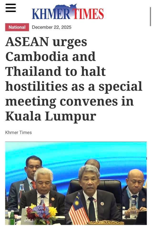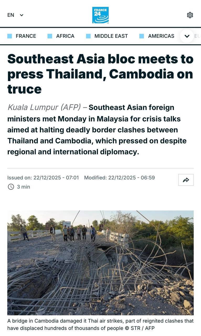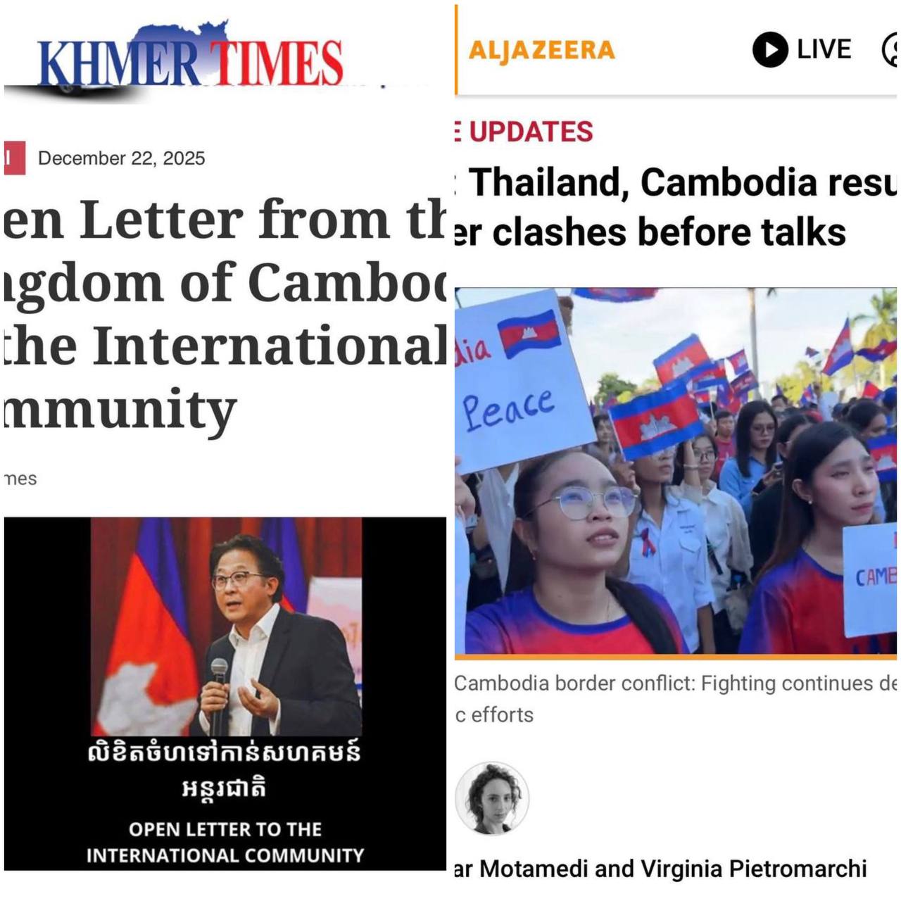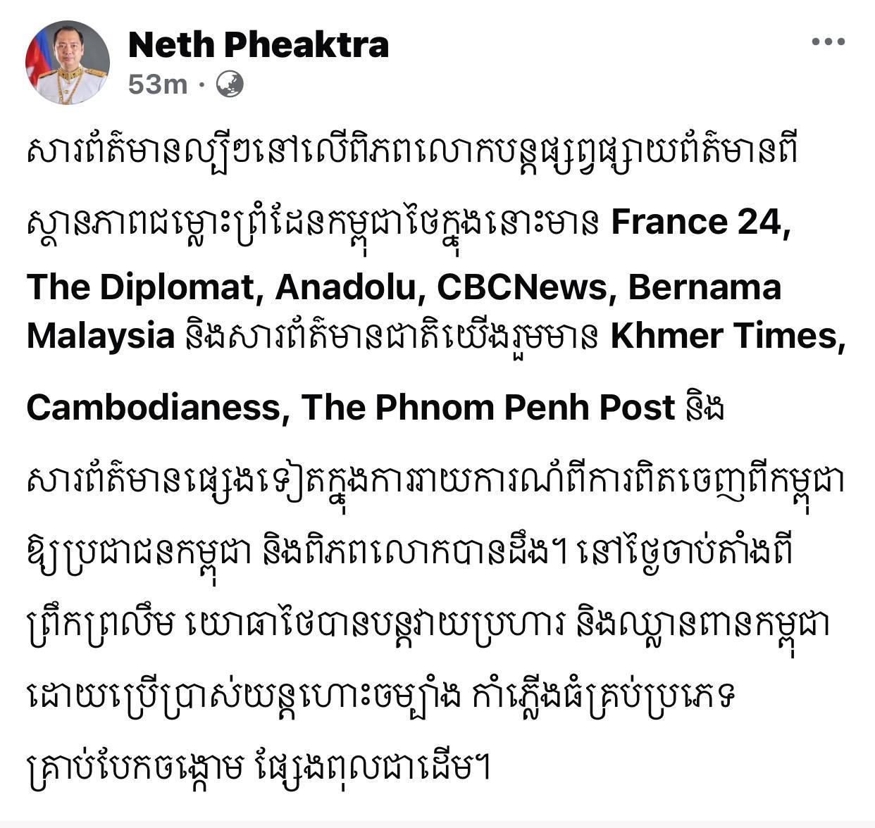 ឯកឧត្តម នេត្រ ភក្ត្រា រដ្ឋមន្ត្រីក្រសួងព័ត៌មាន ៖ សារព័ត៌មានល្បីៗនៅលើពិភពលោកបន្តផ្សព្វផ្សាយព័ត៌មានពីស្ថានភាពជម្លោះព្រំដែនកម្ពុជាថៃក្នុងនោះមាន France 24 The Diplomat Anadolu CBCNews Bernama Malaysia និងសារព័ត៌មានជាតិយើងរួមមាន Khmer Times Cambodianess The Phnom Penh Post និងសារព័ត៌មានផ្សេងទៀតក្នុងការរាយការណ័ពីការពិតចេញពីកម្ពុជាឱ្យប្រជាជនកម្ពុជា និងពិភពលោកបានដឹង។ នៅថ្ងៃនេះចាប់តាំងពីព្រឹកព្រលឹម យោធាថៃបានបន្តវាយប្រហារ និងឈ្លានពានកម្ពុជាដោយប្រើប្រាស់យន្តហោះចម្បាំង កាំភ្លើងធំគ្រប់ប្រភេទ គ្រាប់បែកចង្កោម ផ្សែងពុលជាដើម៕