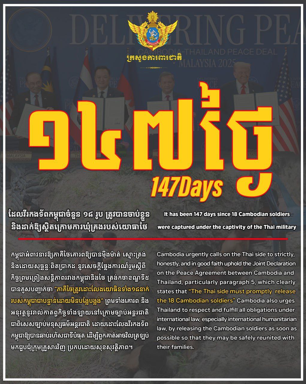 កម្ពុជាអំពាវនាវឱ្យភាគីថៃគោរពឱ្យបានម៉ឺងម៉ាត់ ស្មោះត្រង់ និងដោយសុច្ឆន្ទៈពិតប្រាកដ នូវសេចក្តីថ្លែងការណ៍រួមស្តីពីកិច្ចព្រមព្រៀងសន្តិភាពរវាងកម្ពុជានិងថៃ ត្រង់កថាខណ្ឌទី៥ បានគូសបញ្ជាក់ថា “ភាគីថៃត្រូវដោះលែងយោធិនទាំង១៨នាក់របស់កម្ពុជាជាបន្ទាន់ដោយមិនបង្អែបង្អង់” ព្រមទាំងគោរពនិងអនុវត្តនូវរាល់កាតព្វកិច្ចទាំងឡាយនៅក្រោមច្បាប់អន្តរជាតិ ជាពិសេសច្បាប់មនុស្សធម៌អន្តរជាតិ ដោយដោះលែងវីរកងទ័ពកម្ពុជាឱ្យបានឆាប់រហ័សជាទីបំផុត ដើម្បីពួកគាត់អាចវិលត្រឡប់មកជួបជុំក្រុមគ្រួសារវិញ ប្រកបដោយសុខសុវត្ថិភាព។
