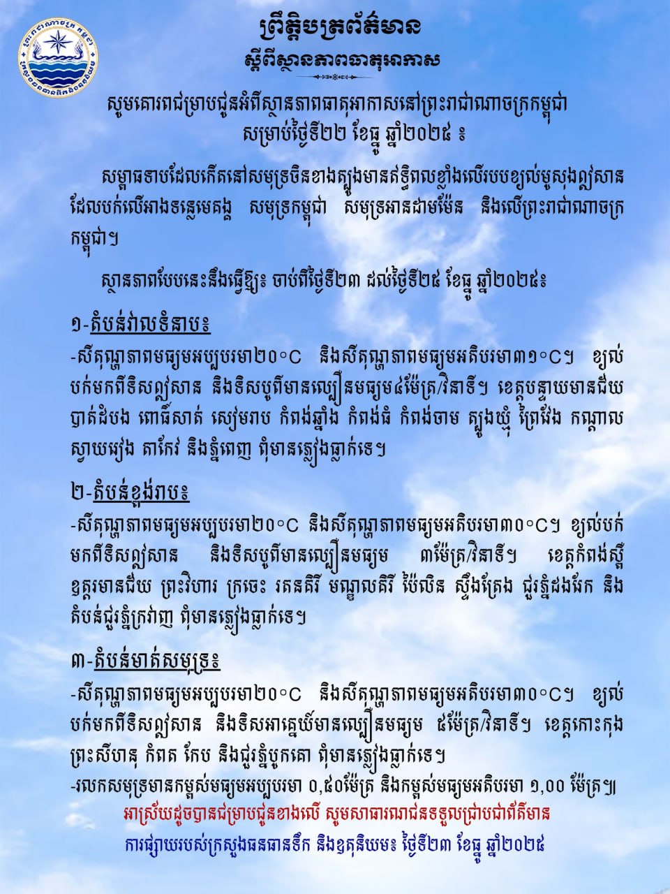 ក្រសួងធនធានទឹក ជូនដំណឹងអំពីស្ថានភាពធាតុអាកាសនៅកម្ពុជា សម្រាប់ថ្ងៃទី២៣ ខែធ្នូ ឆ្នាំ២០២៥