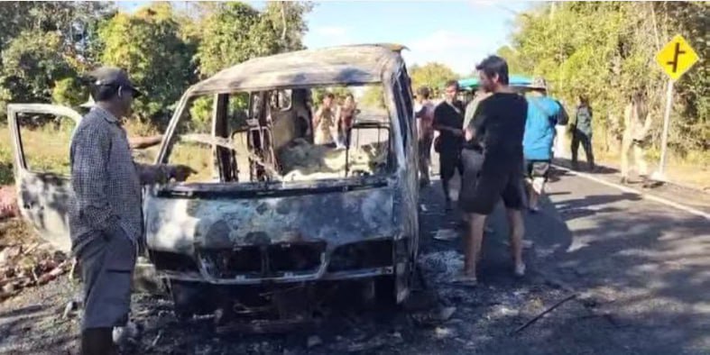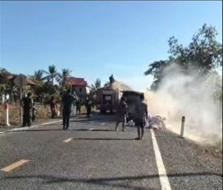 រថយន្តដឹកស្បៀង សម្រាប់ពលរដ្ឋភៀសសឹក ត្រូវភ្លើងឆេះអស់ទាំងស្រុង
