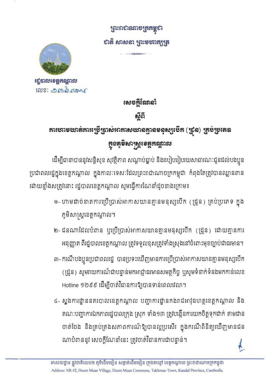 រដ្ឋបាលខេត្តកណ្ដាល ហាមឃាត់ការបង្ហោះដ្រូនគ្រប់ប្រភេទ។ ករណីបងប្អូនប្រទះឃើញដ្រូន សូមទំនាក់ទំនងមកលេខ 1299!