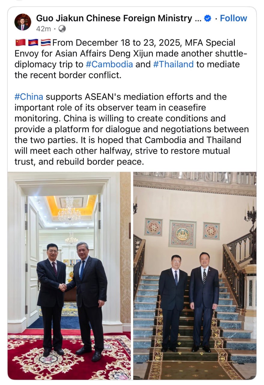 (ប៉េកាំង)៖ បេសកជនពិសេសនៃក្រសួងការបរទេសចិនទទួលបន្ទុកកិច្ចការអាស៊ី លោក តេង ស៊ីជុន (Deng Xijun) បានបញ្ចប់ដំណើរទស្សនកិច្ចការទូតសម្របសម្រួលទៅកាន់ប្រទេសកម្ពុជា និងថៃ ដែលបានធ្វើឡើងចាប់ពីថ្ងៃទី១៨ ដល់ថ្ងៃទី២៣ ខែធ្នូ ឆ្នាំ២០២៥ ដើម្បីដោះស្រាយជម្លោះព្រំដែនចុងក្រោយនេះ។