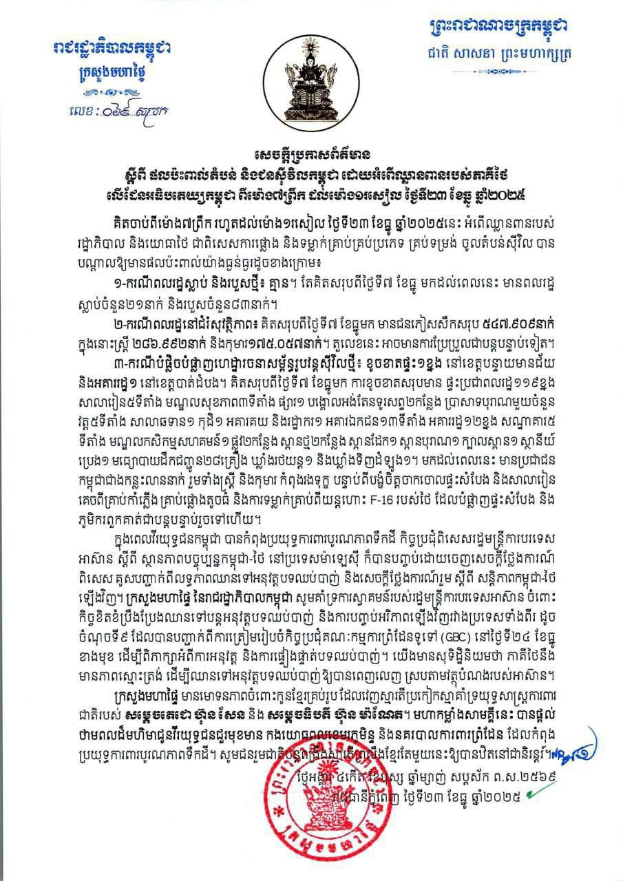 ក្រសួងមហាផ្ទៃ នៃរាជរដ្ឋាភិបាលកម្ពុជា ចេញសេចក្ដីប្រកាសព័ត៌មានស្ដីពី ផលប៉ះពាល់តំបន់ និងជនស៊ីវិលកម្ពុជា ដោយអំពើឈ្លានពានរបស់ភាគីថៃ លើដែនអធិបតេយ្យកម្ពុជា ពីម៉ោង៧ព្រឹក ដល់ម៉ោង១រសៀល ថ្ងៃទី២៣ ខែធ្នូ ឆ្នាំ២០២៥។