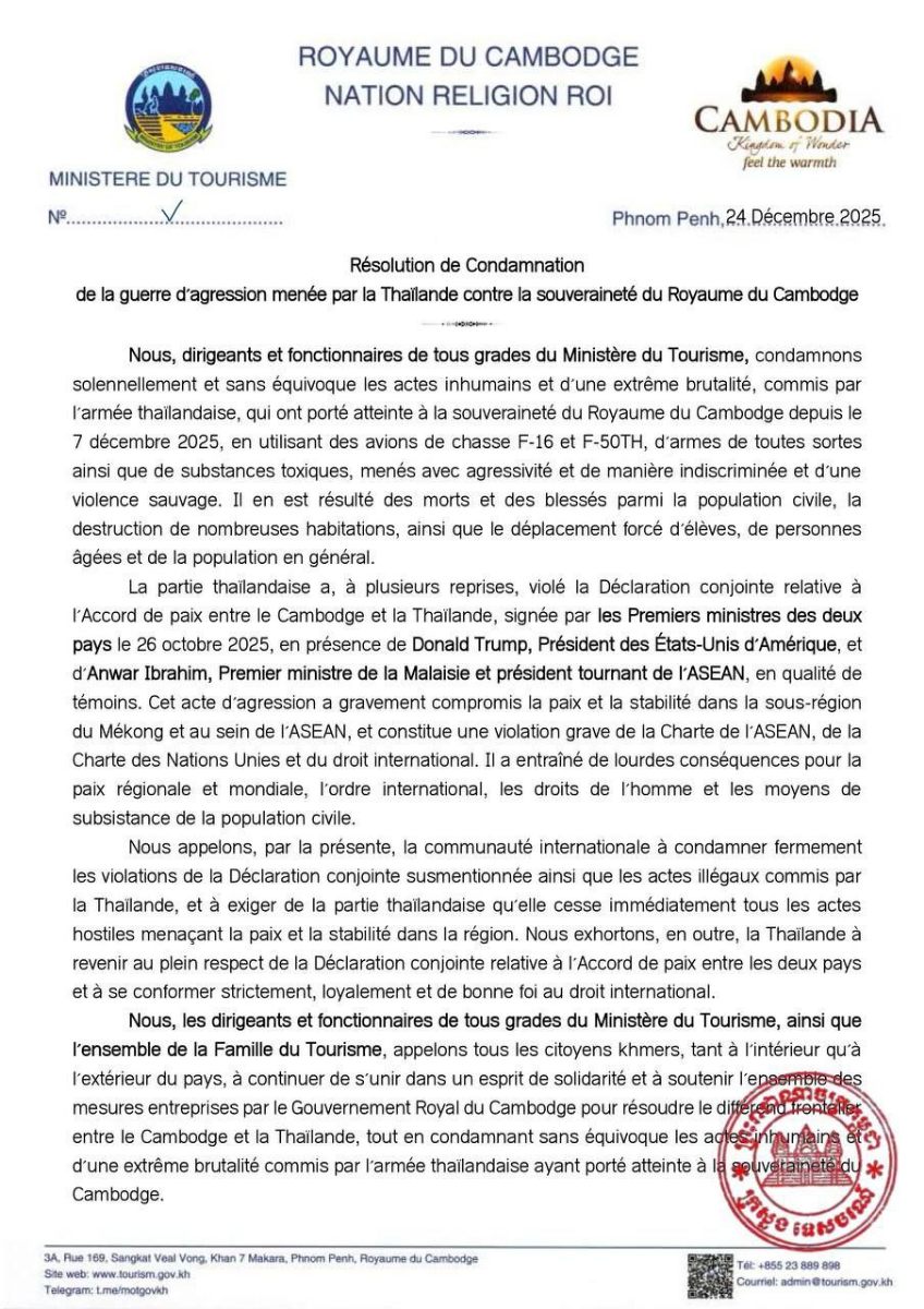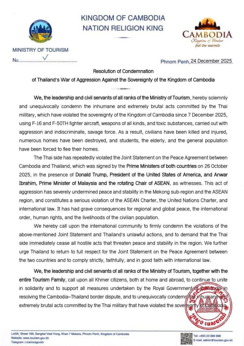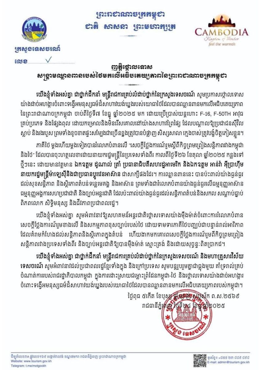 ថ្នាក់ដឹកនាំ មន្ត្រីរាជការគ្រប់លំដាប់ថ្នាក់នៃក្រសួងទេសចរណ៍ នៅថ្ងៃទី២៤ ខែធ្នូ ឆ្នាំ២០២៥ នេះ បានប្រកាសថ្កោលទោស យ៉ាងដាច់អហង្ការចំពោះទង្វើអមនុស្សធម៌ដ៏សាហាវយង់ឃ្នងរបស់យោធាថៃដែលបានឈ្លានពានមកលើអធិបតេយ្យភាព នៃព្រះរាជាណាចក្រកម្ពុជា ចាប់ពីថ្ងៃទី៧ ខែធ្នូ ឆ្នាំ២០២៥ មក ដោយប្រើប្រាស់យន្តហោះ F-16, F-50TH អាវុធ គ្រប់ប្រភេទ និងផ្សែងពុល ដោយកម្រោលនិងមិនរើសគោលដៅយ៉ាងសាហាវព្រៃផ្សៃ ដែលបណ្តាលឱ្យប្រជាជនស៊ីវិល ស្លាប់ និងរងរបួស ព្រមទាំងខូចខាតផ្ទះសម្បែងជាច្រើនខ្នងត្រូវបានបំផ្លាញ សិស្សសាលា ក្មេងចាស់ត្រូវបង្ខំចិត្តភៀសខ្លួន។