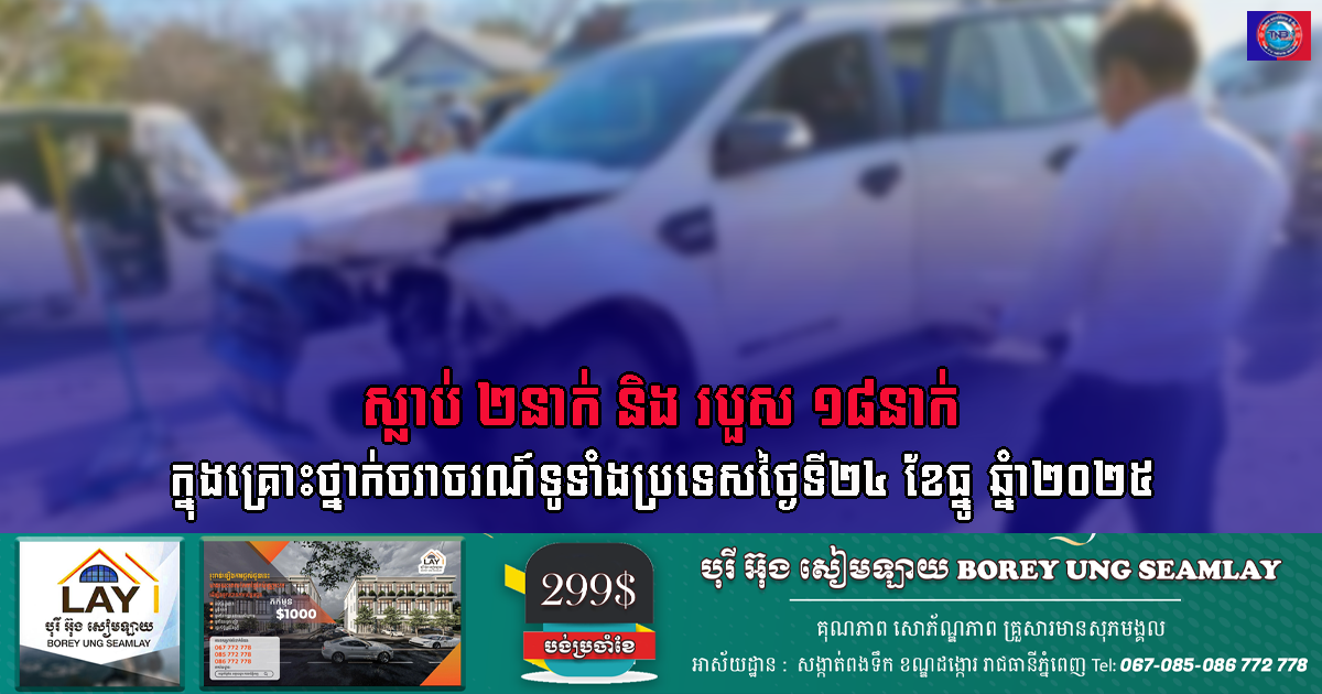 ស្លាប់២នាក់ និងរបួស១៨នាក់ ក្នុងគ្រោះថ្នាក់ចរាចរណ៍ទូទាំងប្រទេសថ្ងៃទី២៤ ខែធ្នូ ឆ្នំា២០២៥