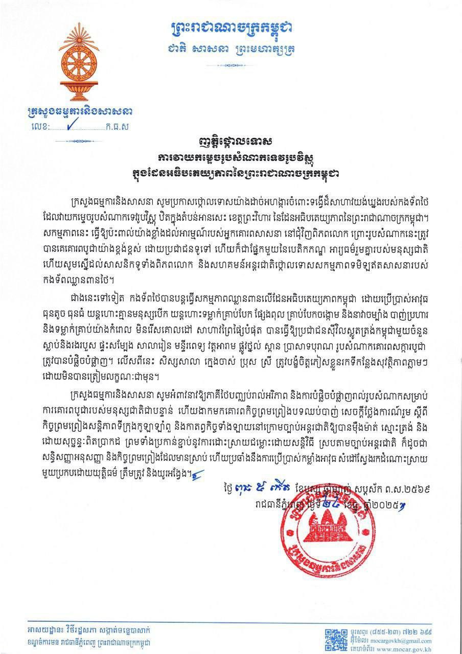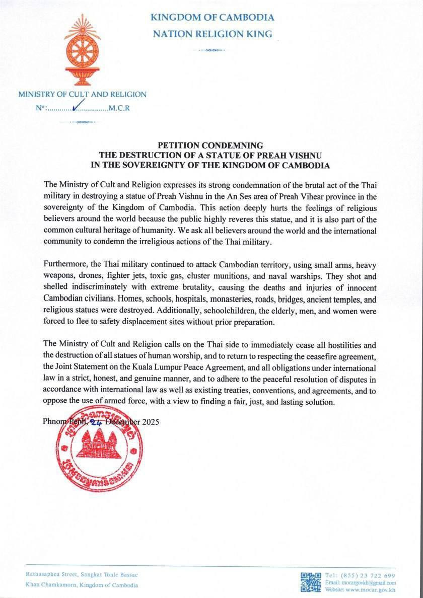 ញត្តិថ្កោលទោស របស់ក្រសួងធម្មការនិងសាសនា ចំពោះការវាយកម្ទេចរូបសំណាកទេវរូបវិស្ណុ ក្នុងដែនអធិបតេយ្យភាព នៃព្រះរាជាណាចក្រកម្ពុជា។