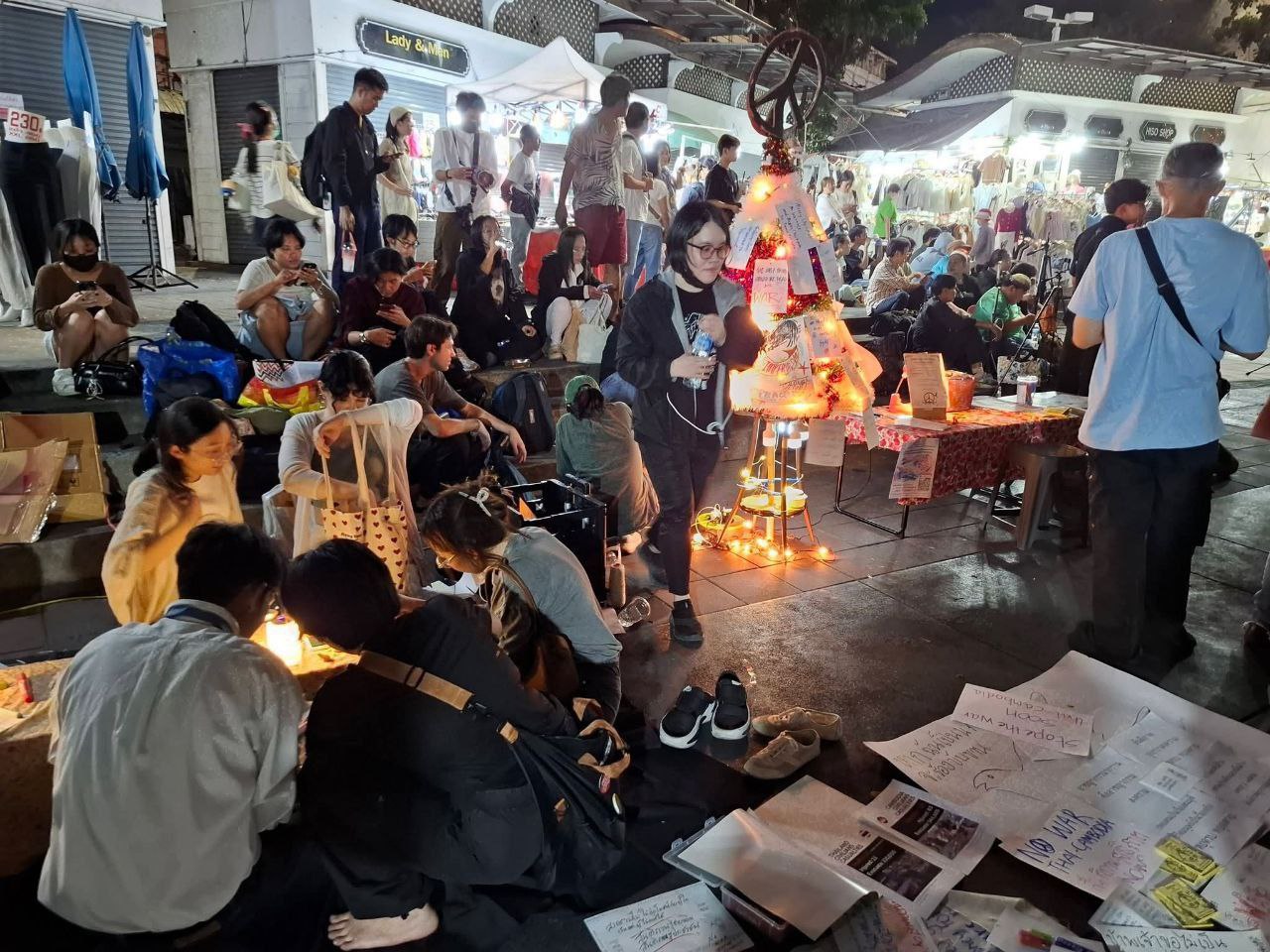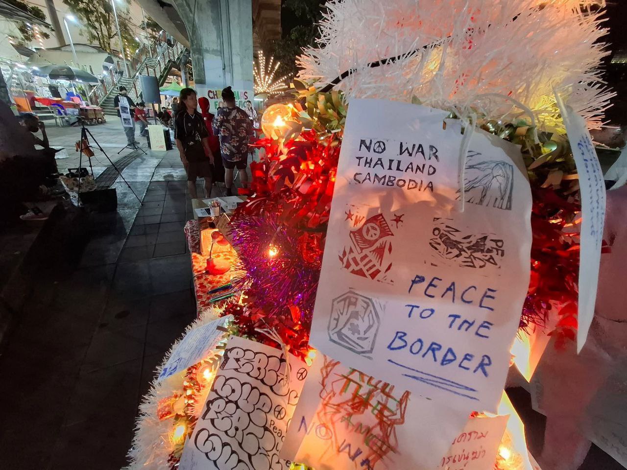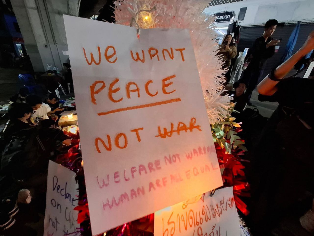 ក្រុមបាតុករប្រឆាំងសង្គ្រាមនៅប្រទេសថៃបានប្រមូលផ្តុំគ្នានៅវិមានជ័យជំនះនៅយប់ថ្ងៃព្រហស្បតិ៍ ទី២៥ ខែធ្នូ ដើម្បីអំពាវនាវឱ្យមានសន្តិភាពរវាងប្រទេសថៃ និងប្រទេសកម្ពុជា បន្ទាប់ពីសង្គ្រាមព្រំដែនរយៈពេល ១៨ថ្ងៃ។