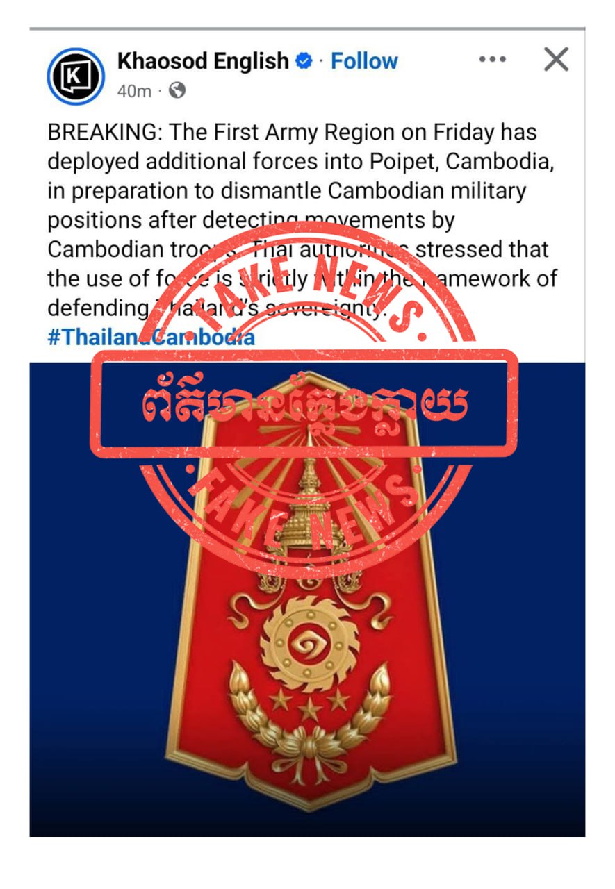 ការផ្សាយរបស់បណ្តាញសារព័ត៌មានមួយចំនួនរបស់ថៃដែលបានផ្សព្វផ្សាយចោទប្រកាន់ លាបពណ៌កងទ័ពកម្ពុជាថា «កម្ពុជាបានធ្វើការចល័តកងទ័ពចូលក្នុងតំបន់ប៉ោយប៉ែត ខេត្តបន្ទាយមានជ័យ»។